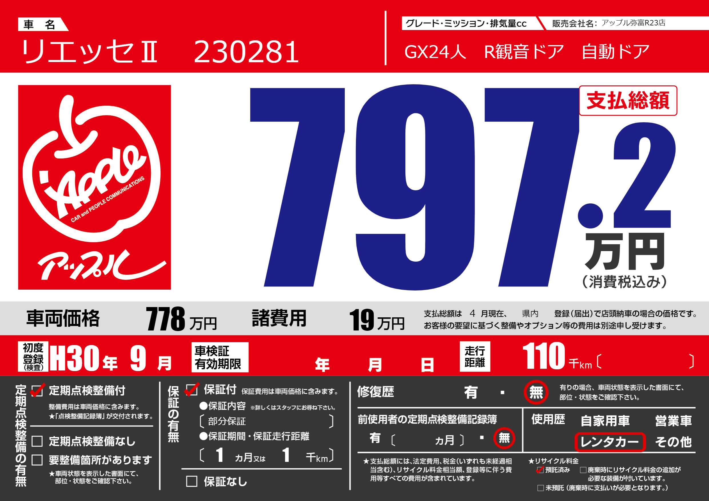 | 車名 | リエッセⅡ 230281 | グレード ミッション 排気量 |