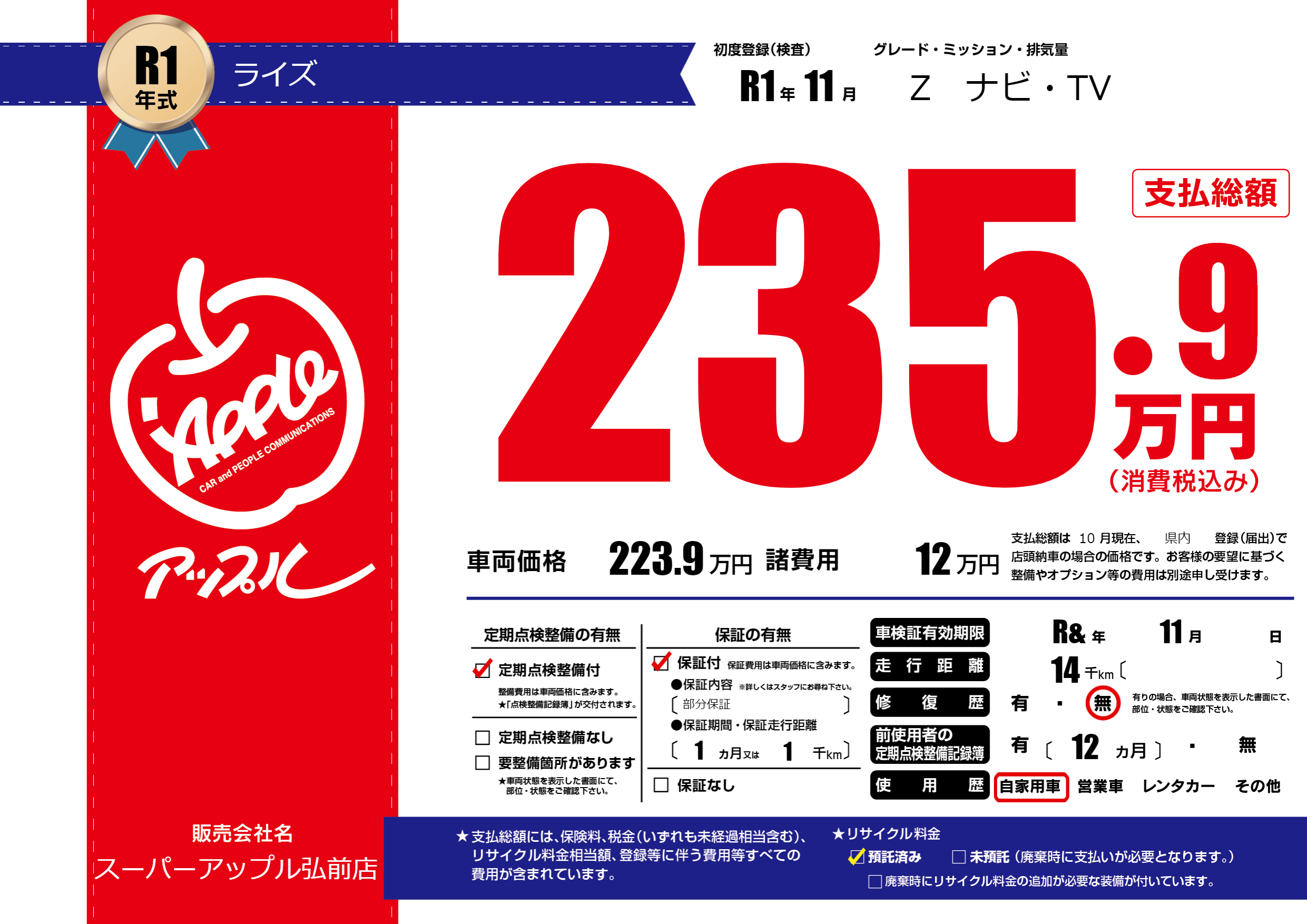 | 走行キロ | 1.4万km | 初年度登録 | R1年11月 |