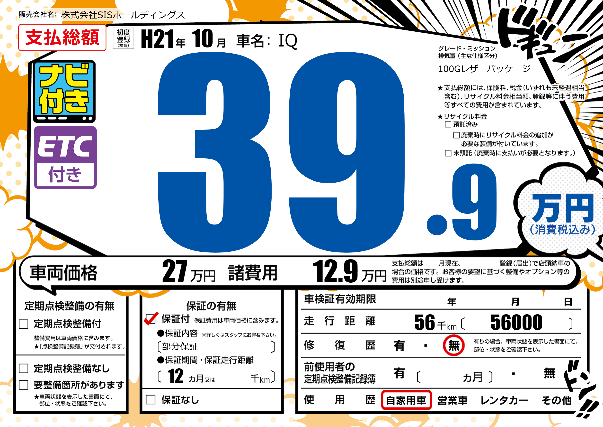 | 走行キロ | 5.6万km | 初年度登録 | H21年10月 |