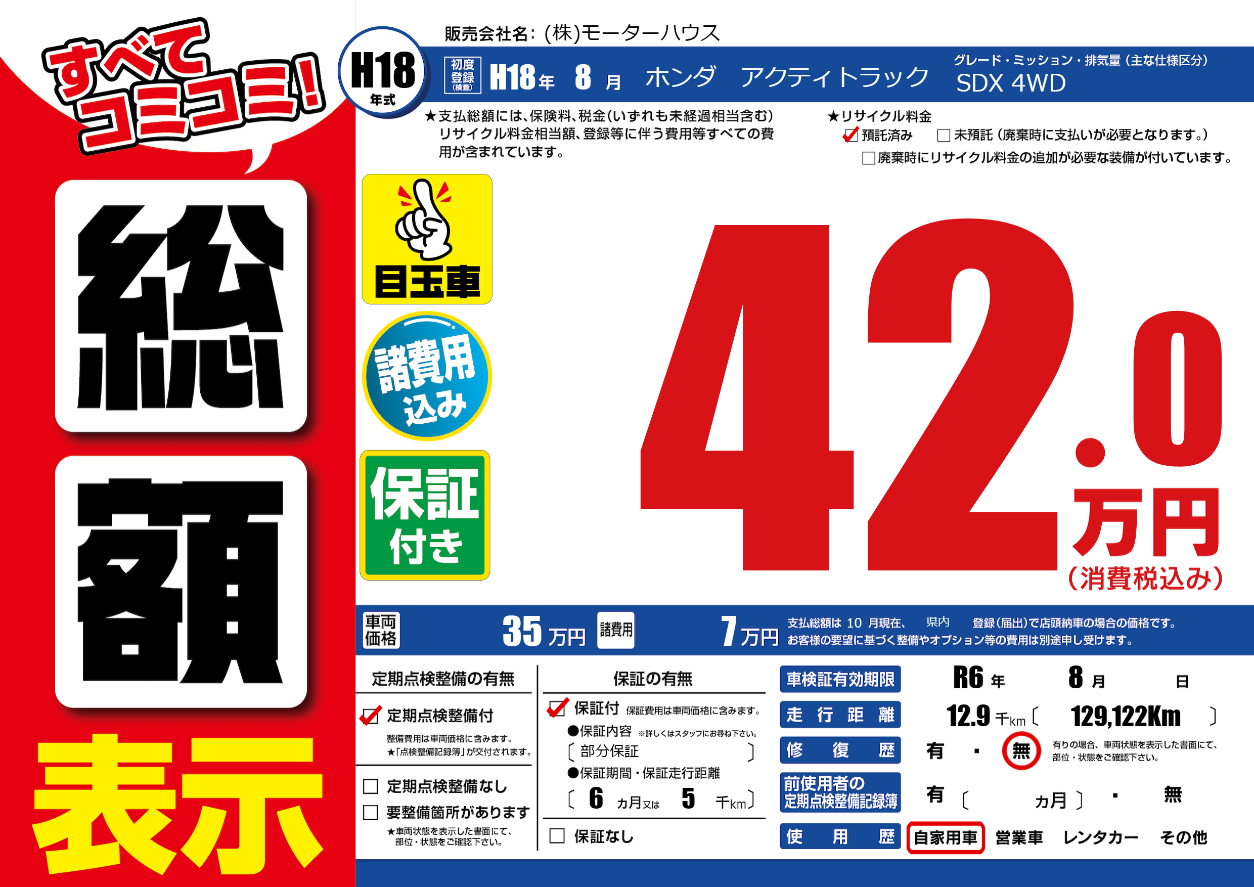 保証なし 保証内容(部分保証) 6ヶ月または(5)千kmまで |