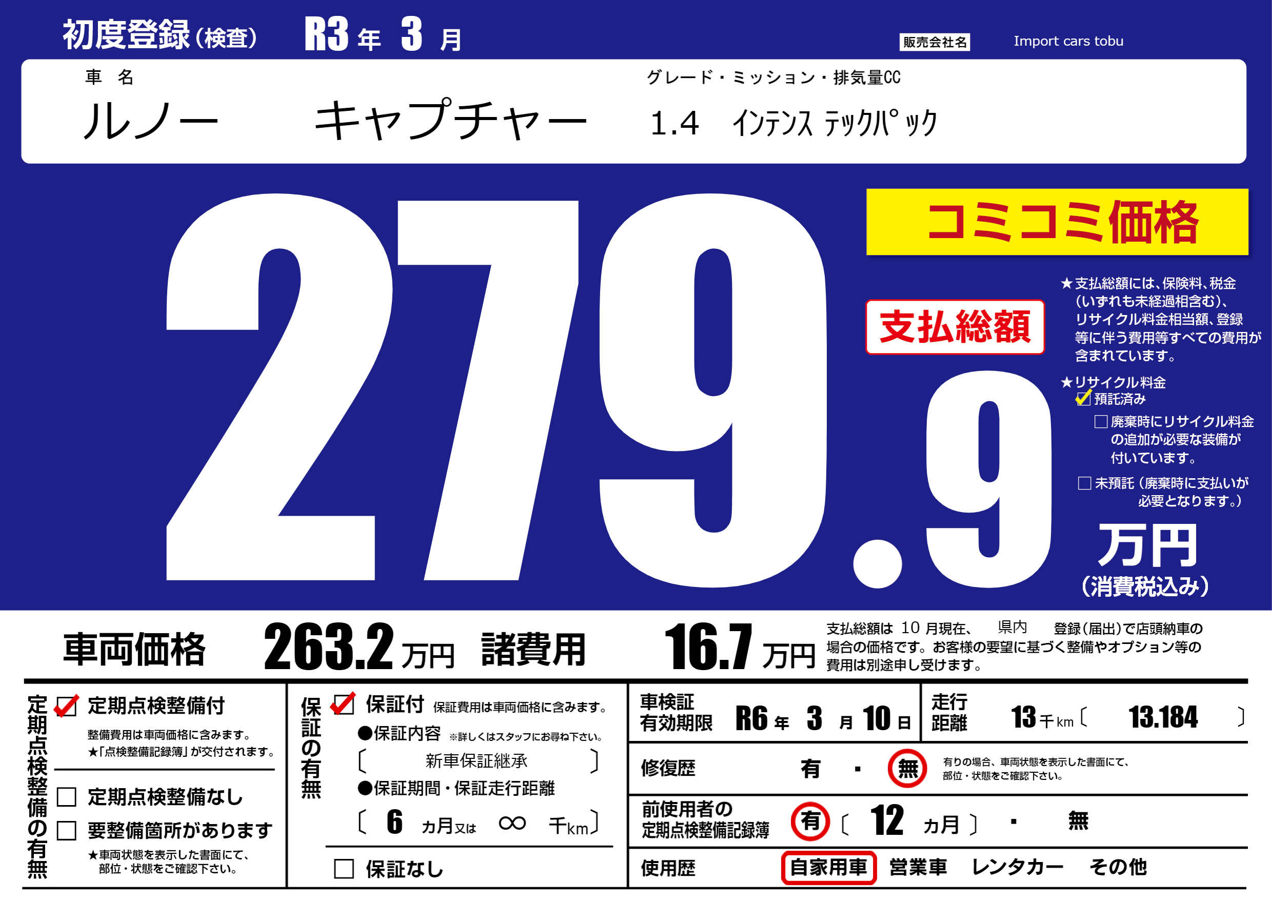 保証付き 保証内容( 新車保証継承) 6ヶ月または(∞)千kmまで |