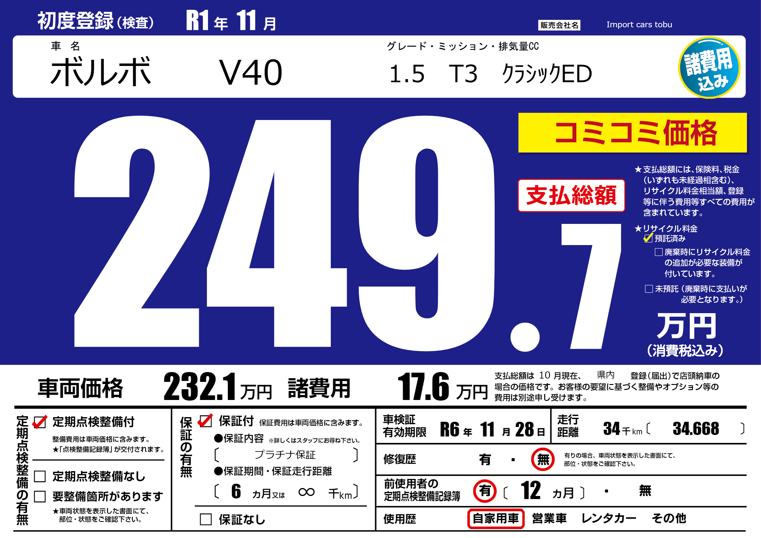 | 車名 | ボルボ V40 | グレード ミッション 排気量 |