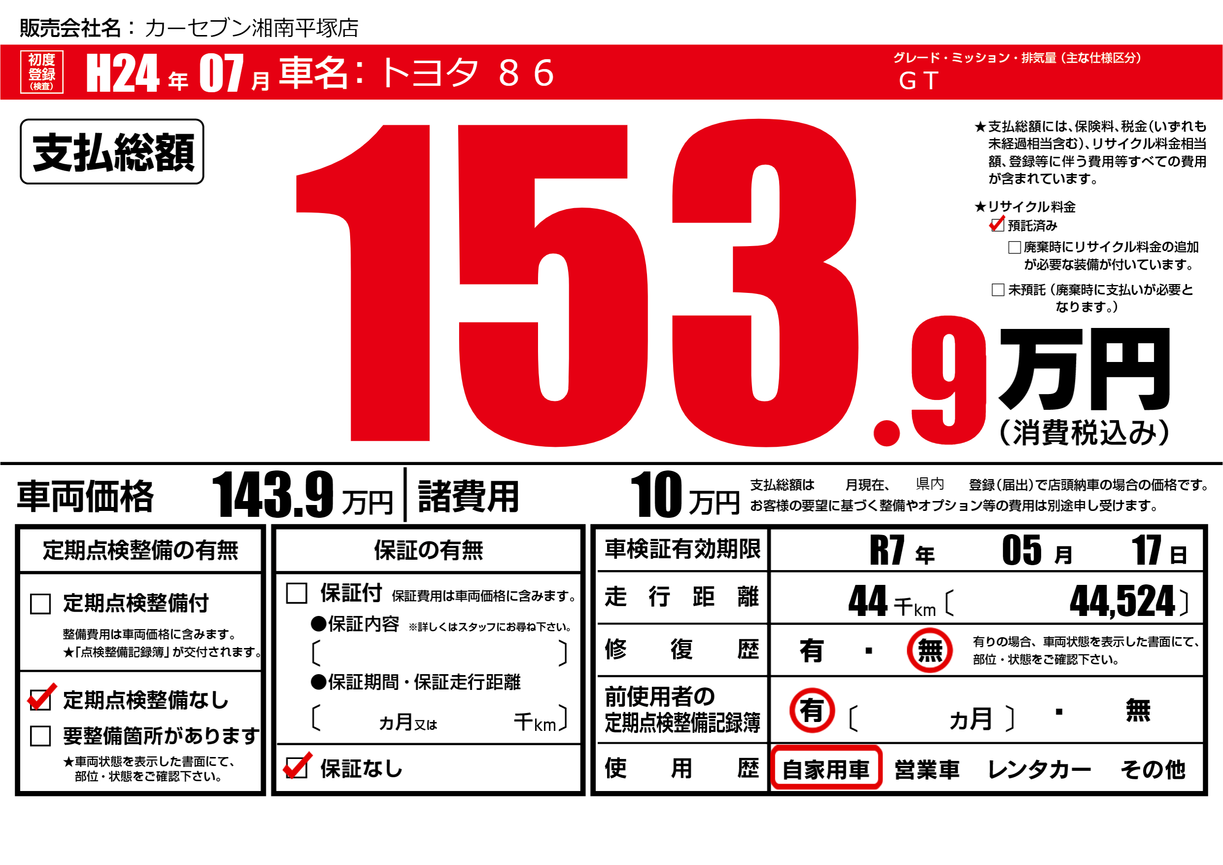 | 定期点検整備 | 定期点検整備なし | ||