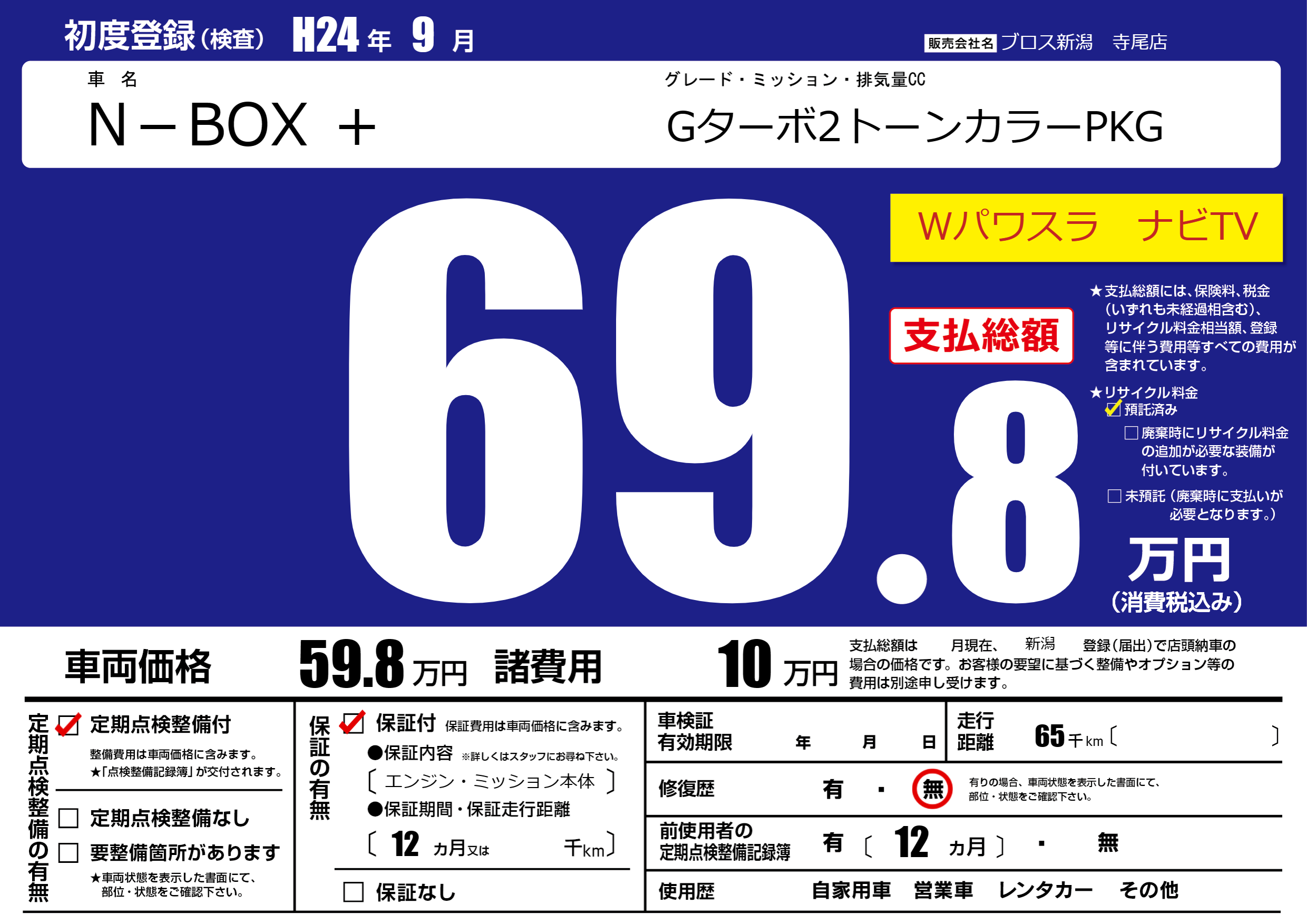 | 車名 | N-BOX + | グレード ミッション 排気量 |