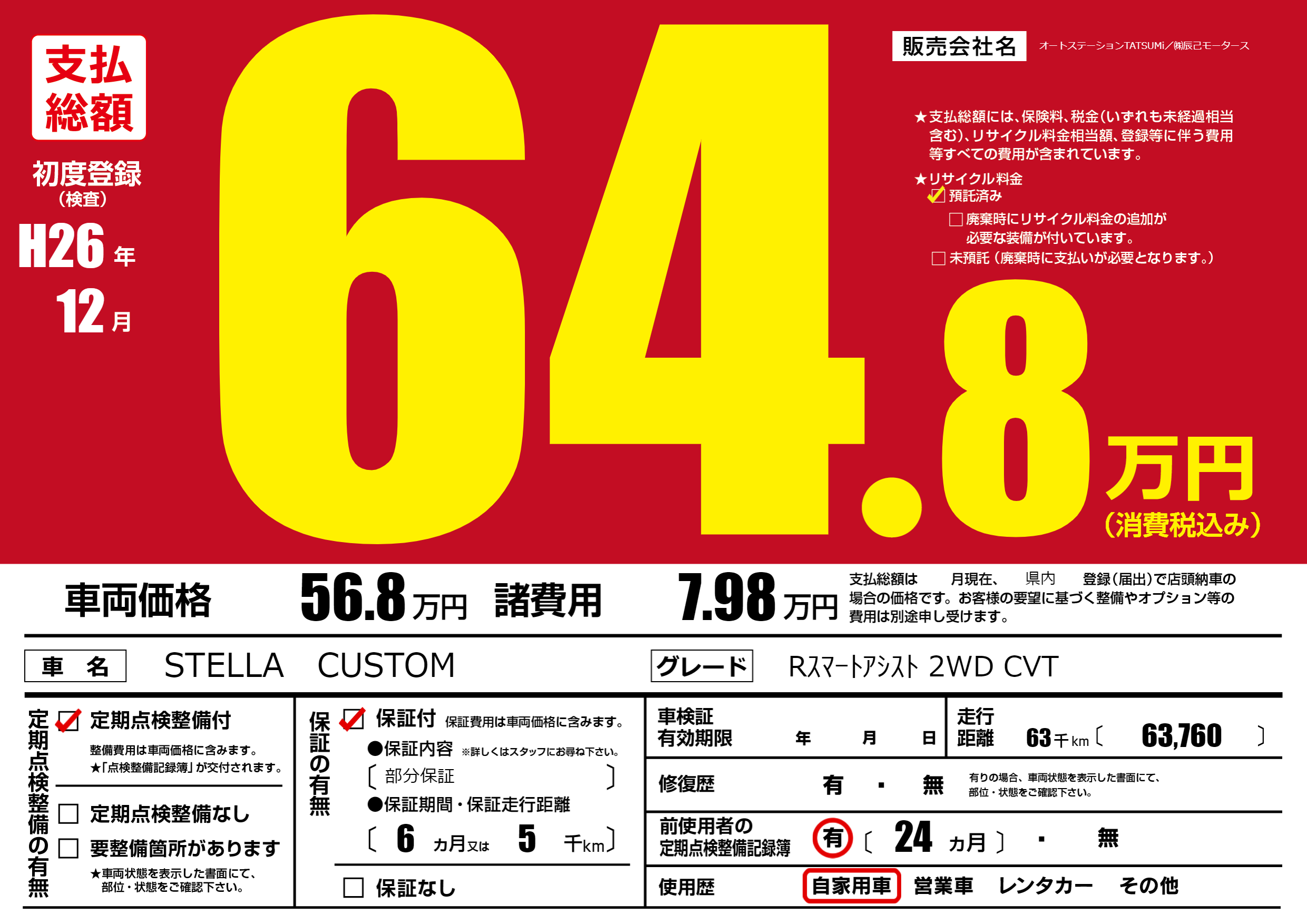 | 車名 | STELLA CUSTOM | グレード ミッション 排気量 |