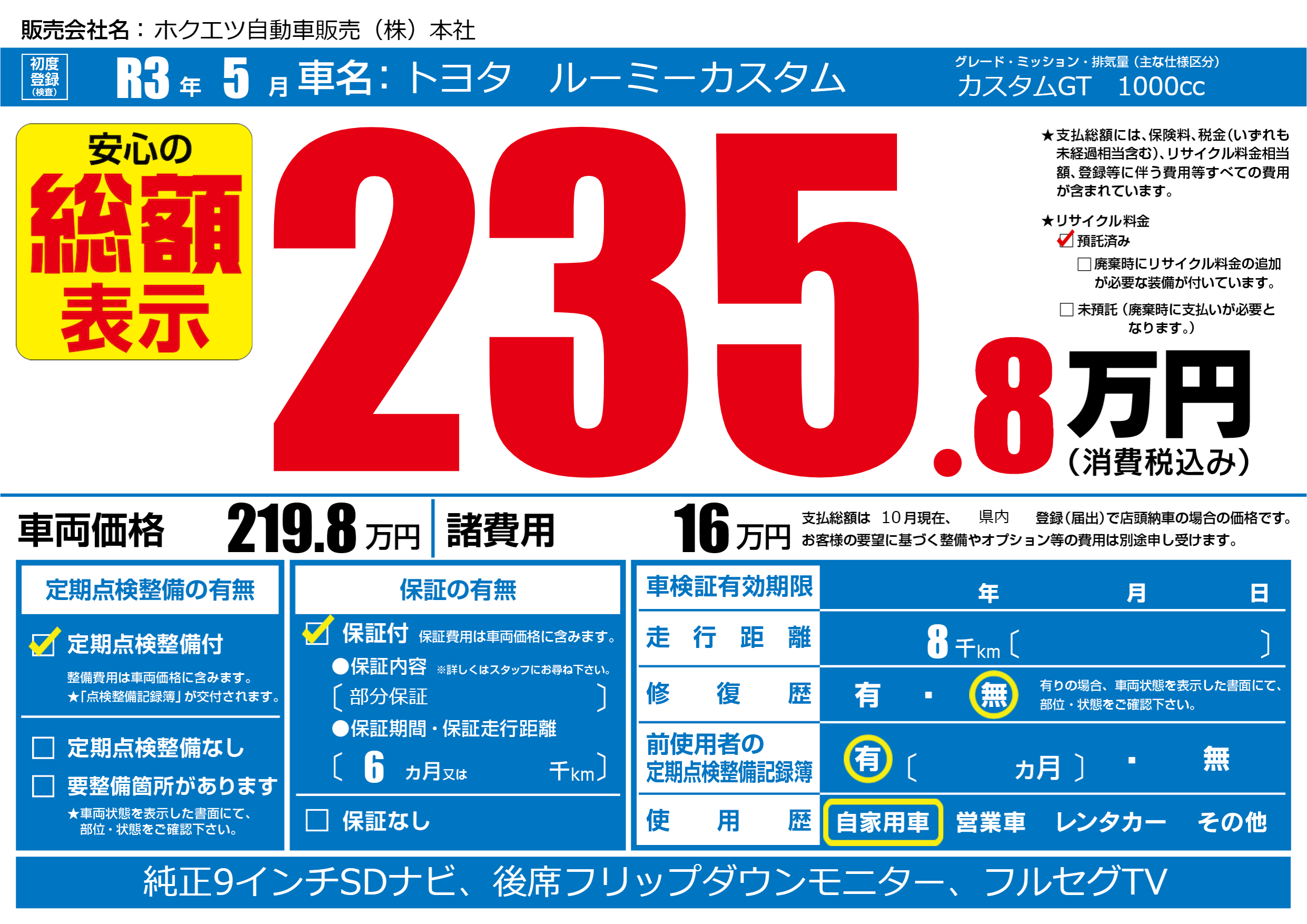 | 走行キロ | 0.8万km | 初年度登録 | R3年5月 |