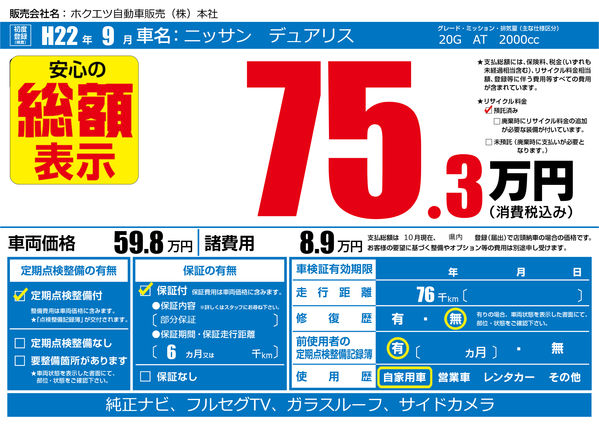 | 走行キロ | 7.6万km | 初年度登録 | H22年9月 |