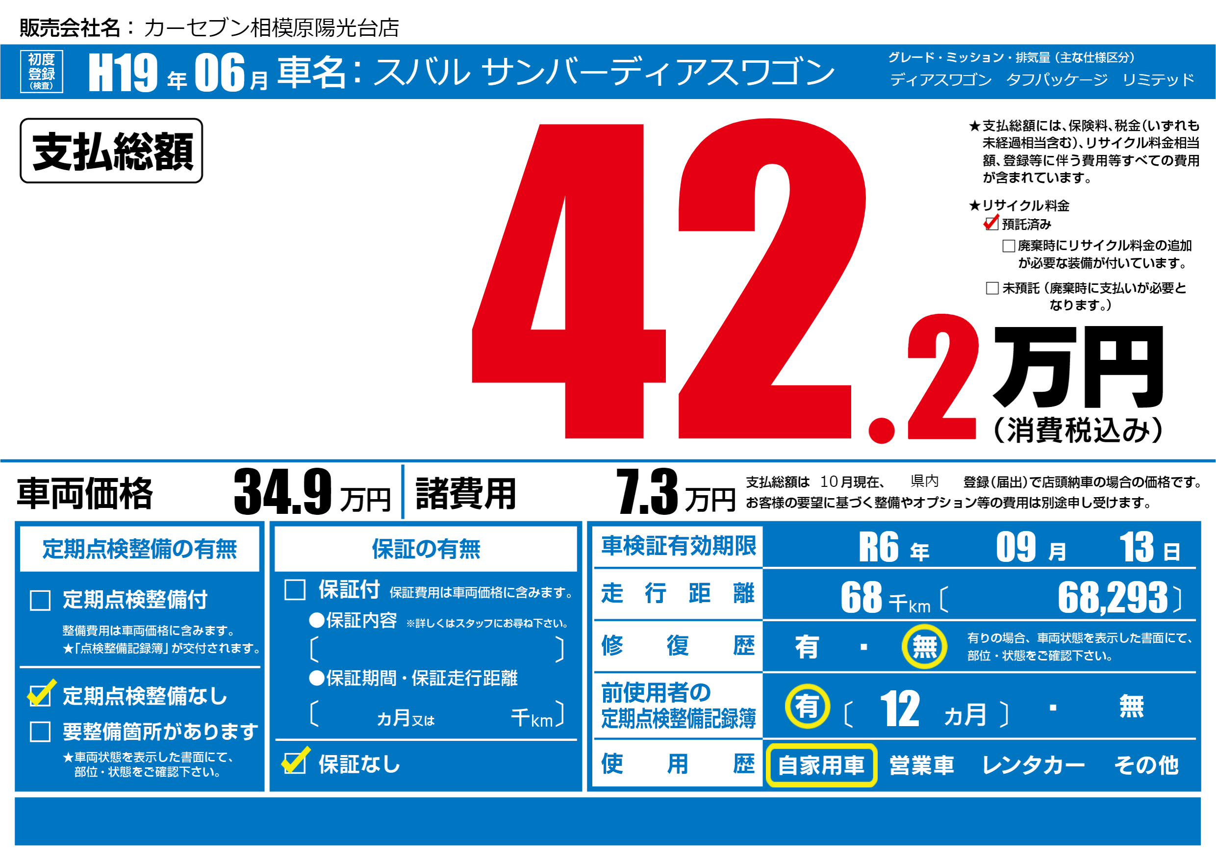 | 走行キロ | 6.8万km | 初年度登録 | H19年06月 |