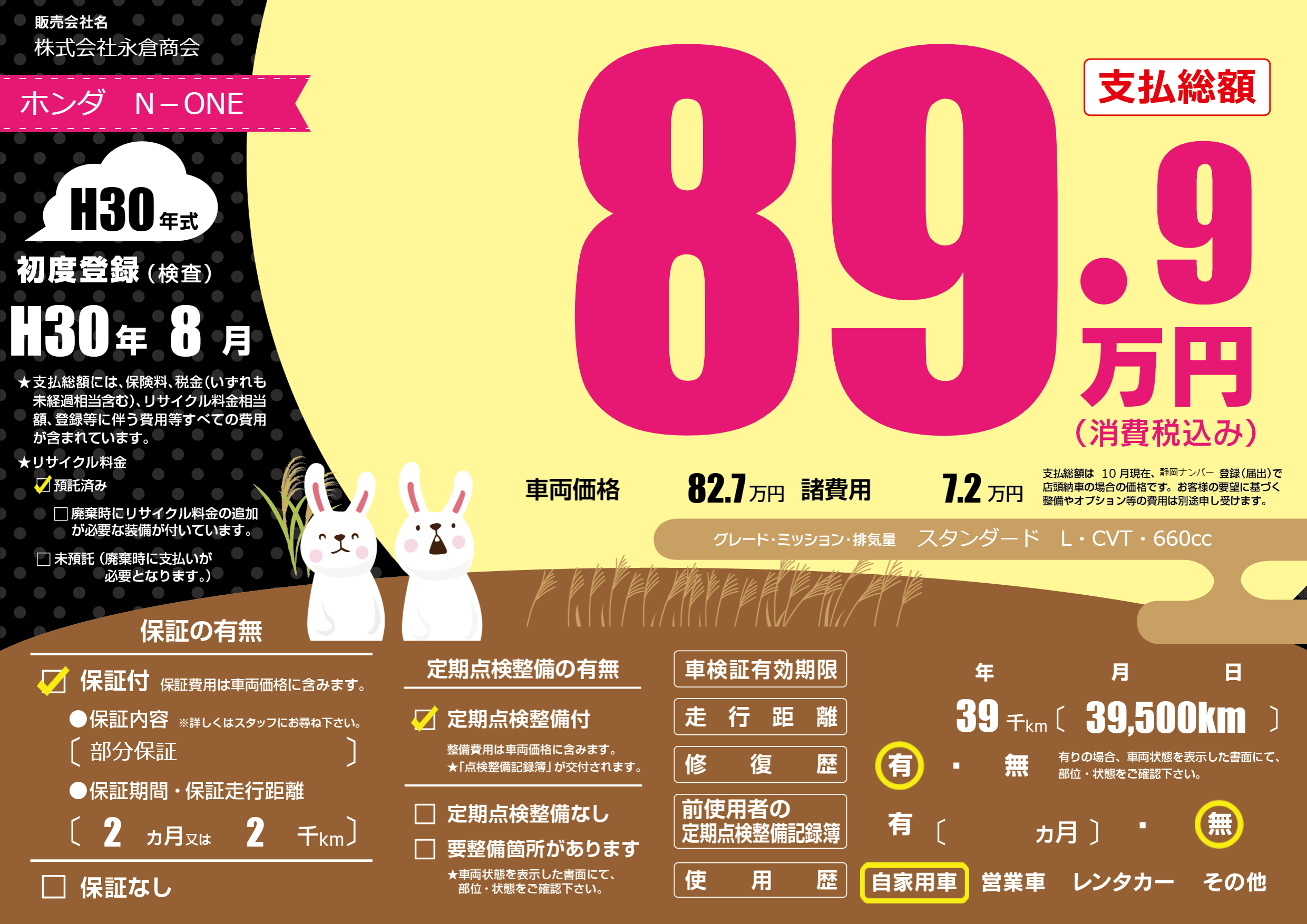 | 車名 | ホンダ N-ONE | グレード ミッション 排気量 |