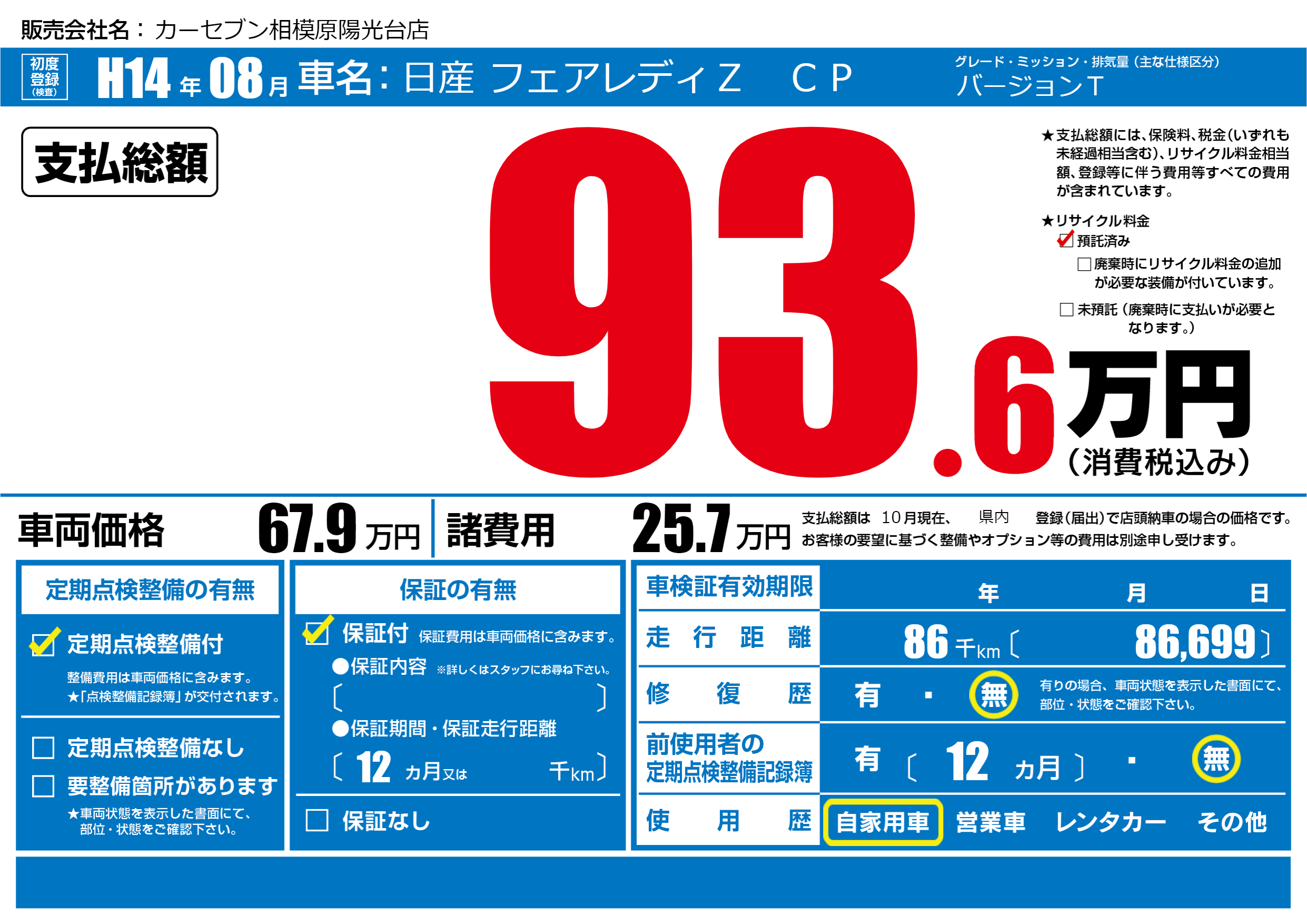 | 車名 | 日産 フェアレディZ CP | グレード ミッション 排気量 |