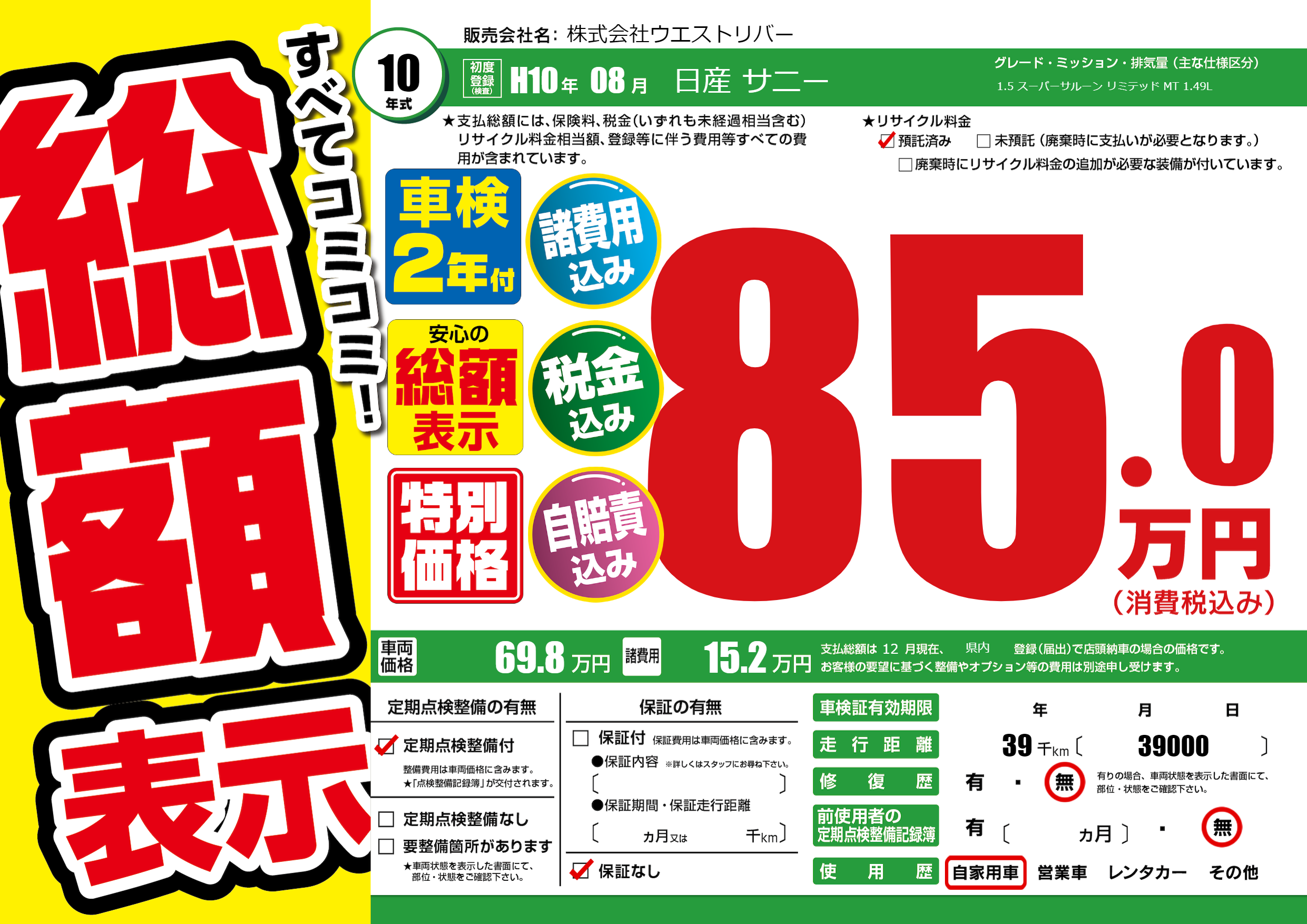 | 車名 | 日産 サニー | グレード ミッション 排気量 |