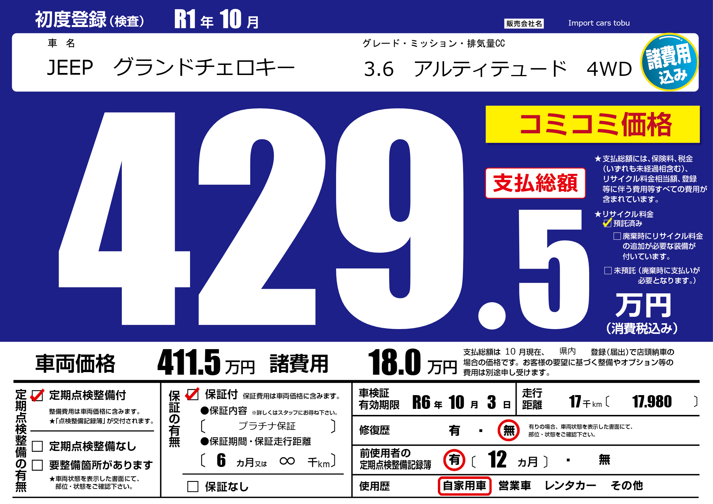| 車名 | JEEP グランドチェロキー | グレード ミッション 排気量 |