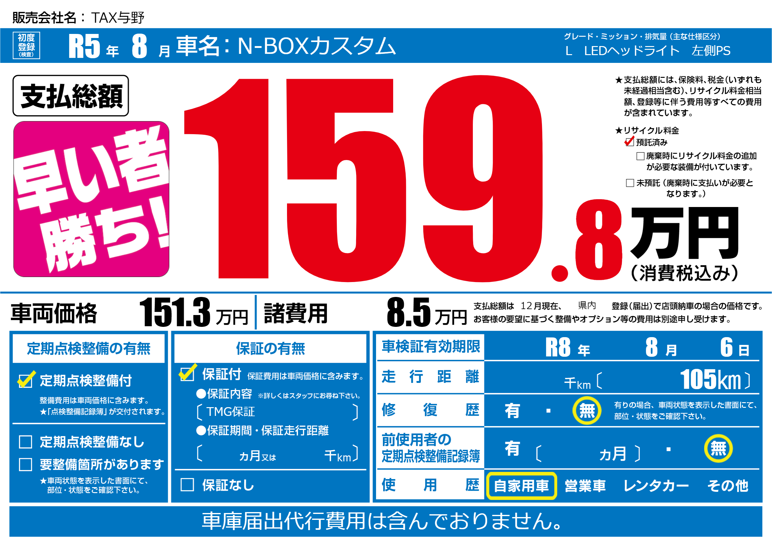 | 走行キロ | - | 初年度登録 | R5年8月 |