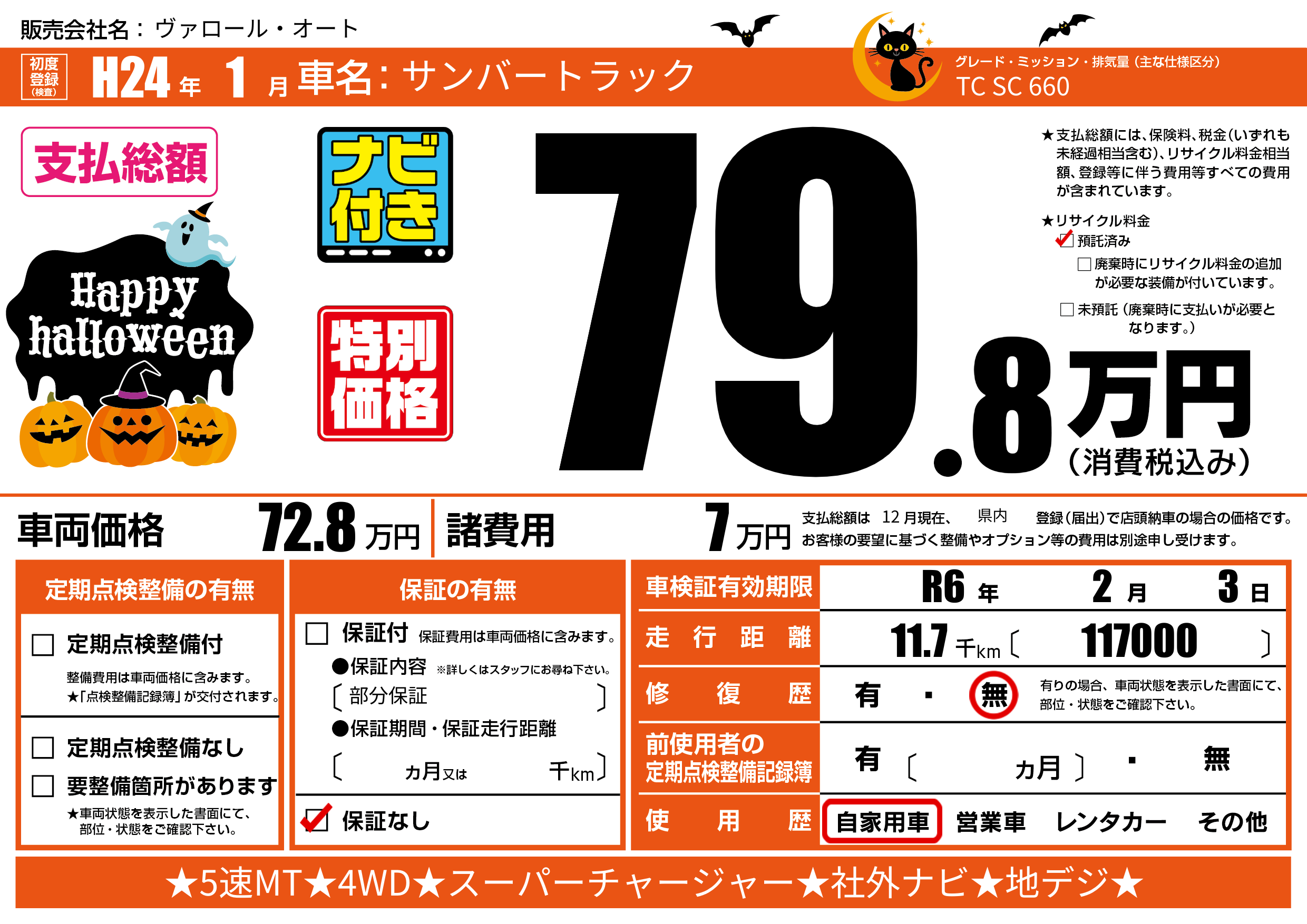 | 車名 | サンバートラック | グレード ミッション 排気量 |