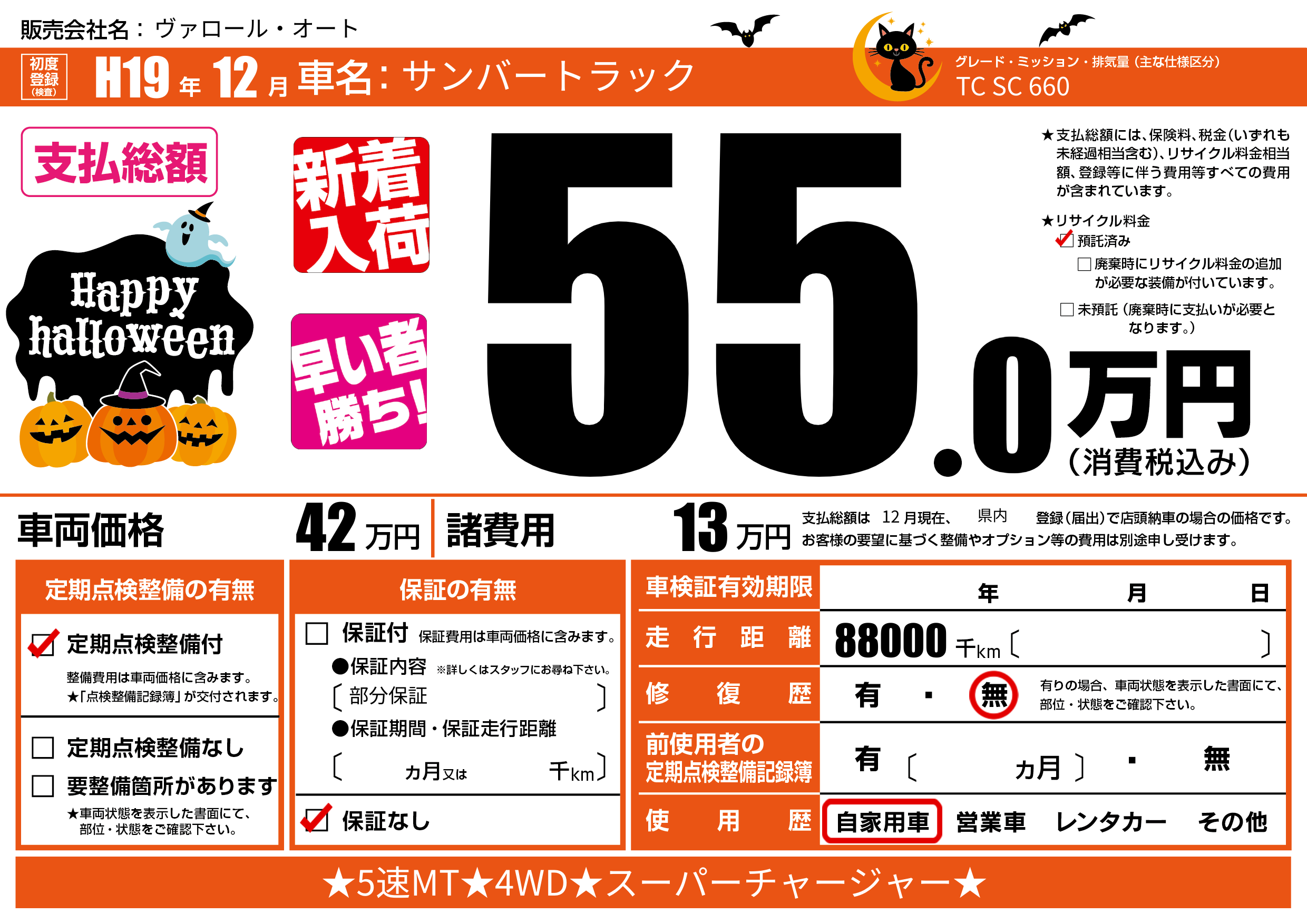 | 車名 | サンバートラック | グレード ミッション 排気量 |