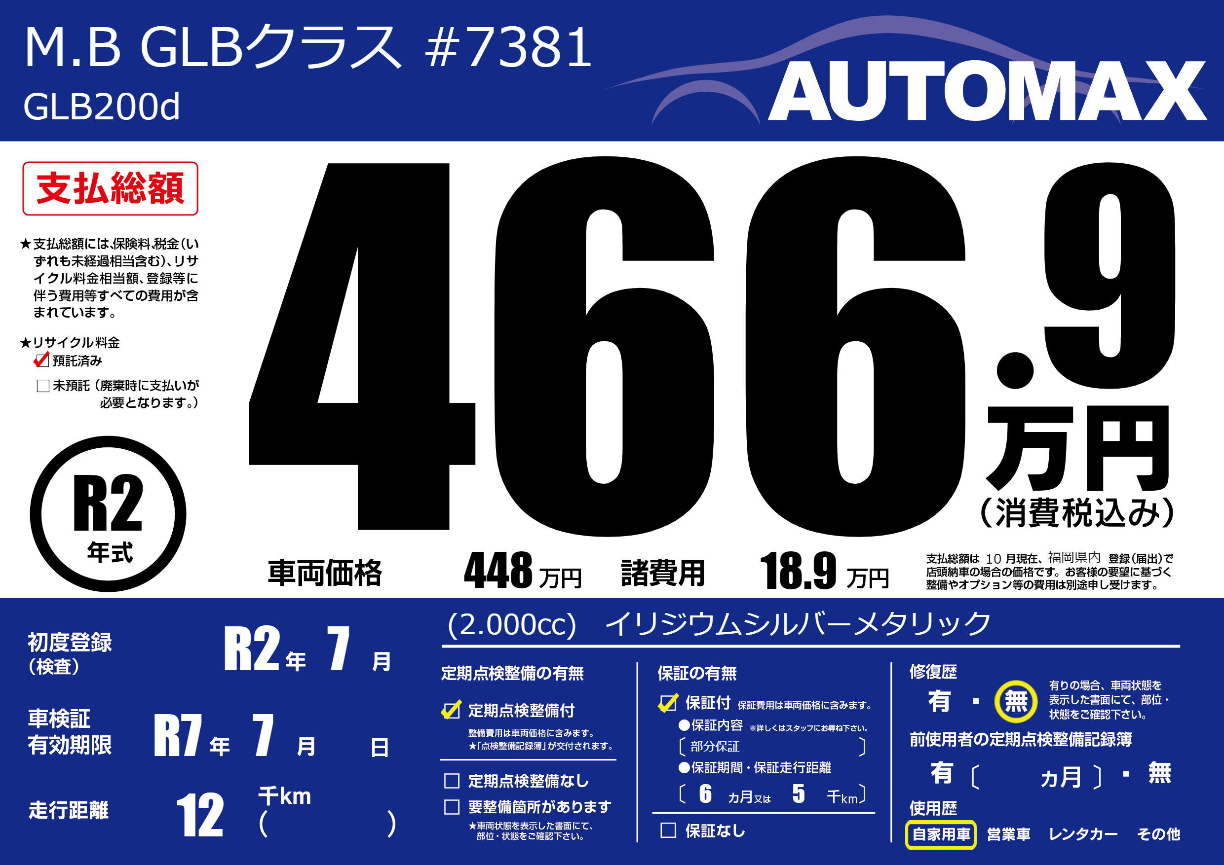 | 車名 | M.B GLBクラス #7381 | グレード ミッション 排気量 |