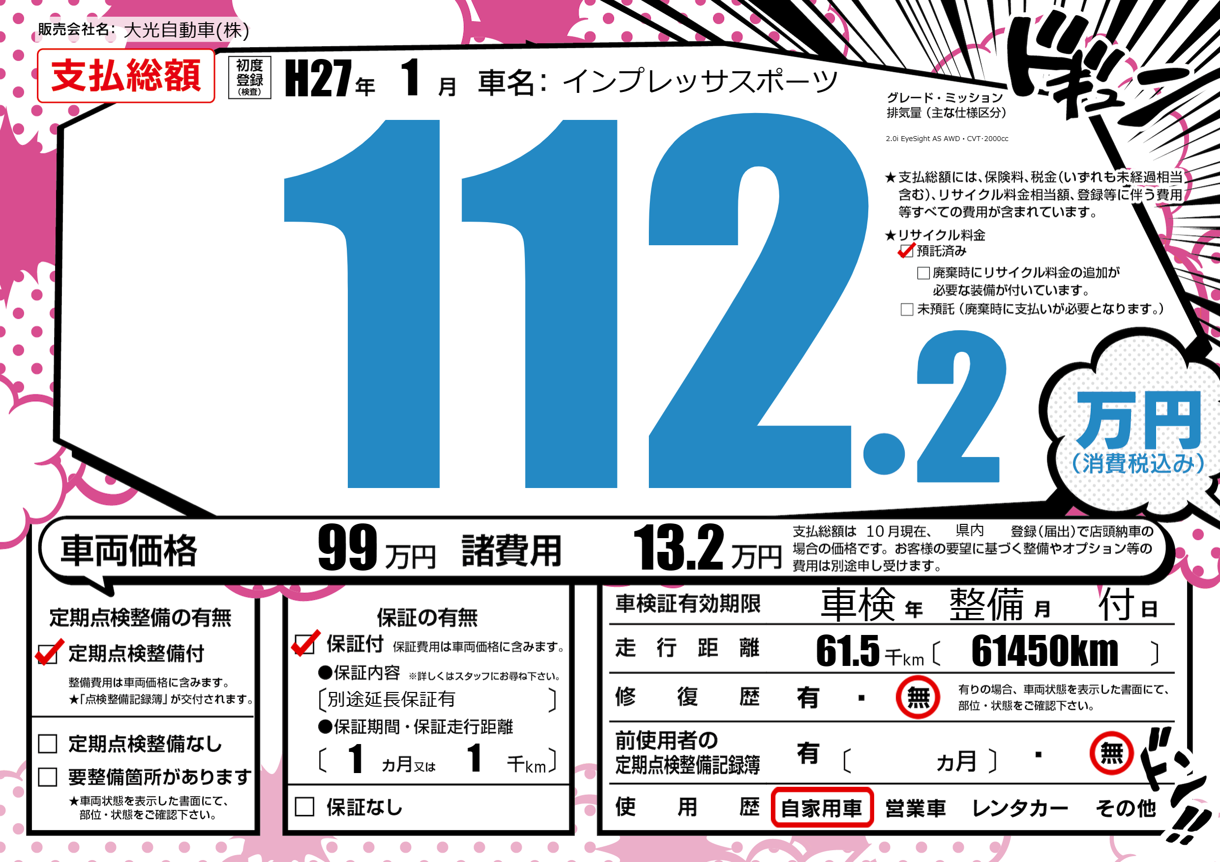 | 車名 | インプレッサスポーツ | グレード ミッション 排気量 |