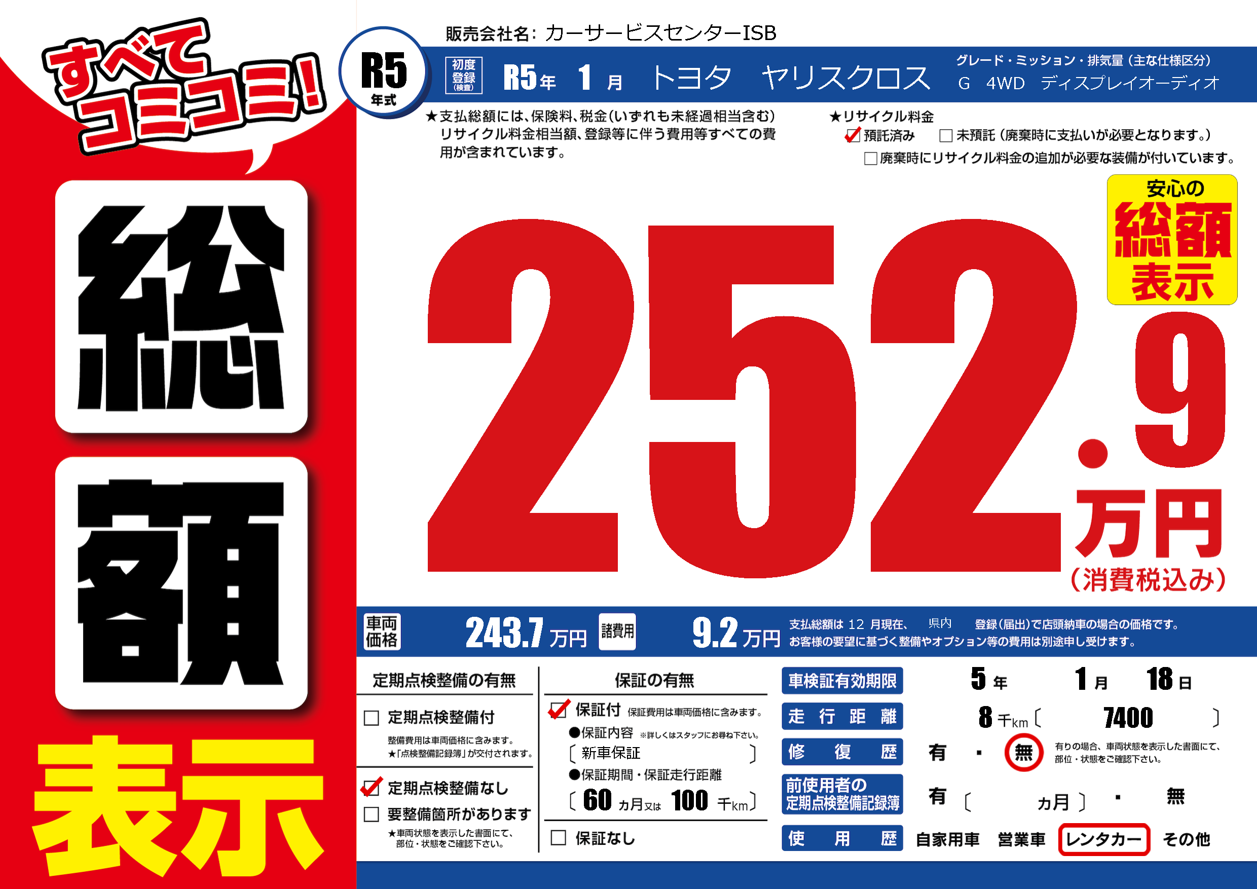 | 走行キロ | 0.8万km | 初年度登録 | R5年1月 |