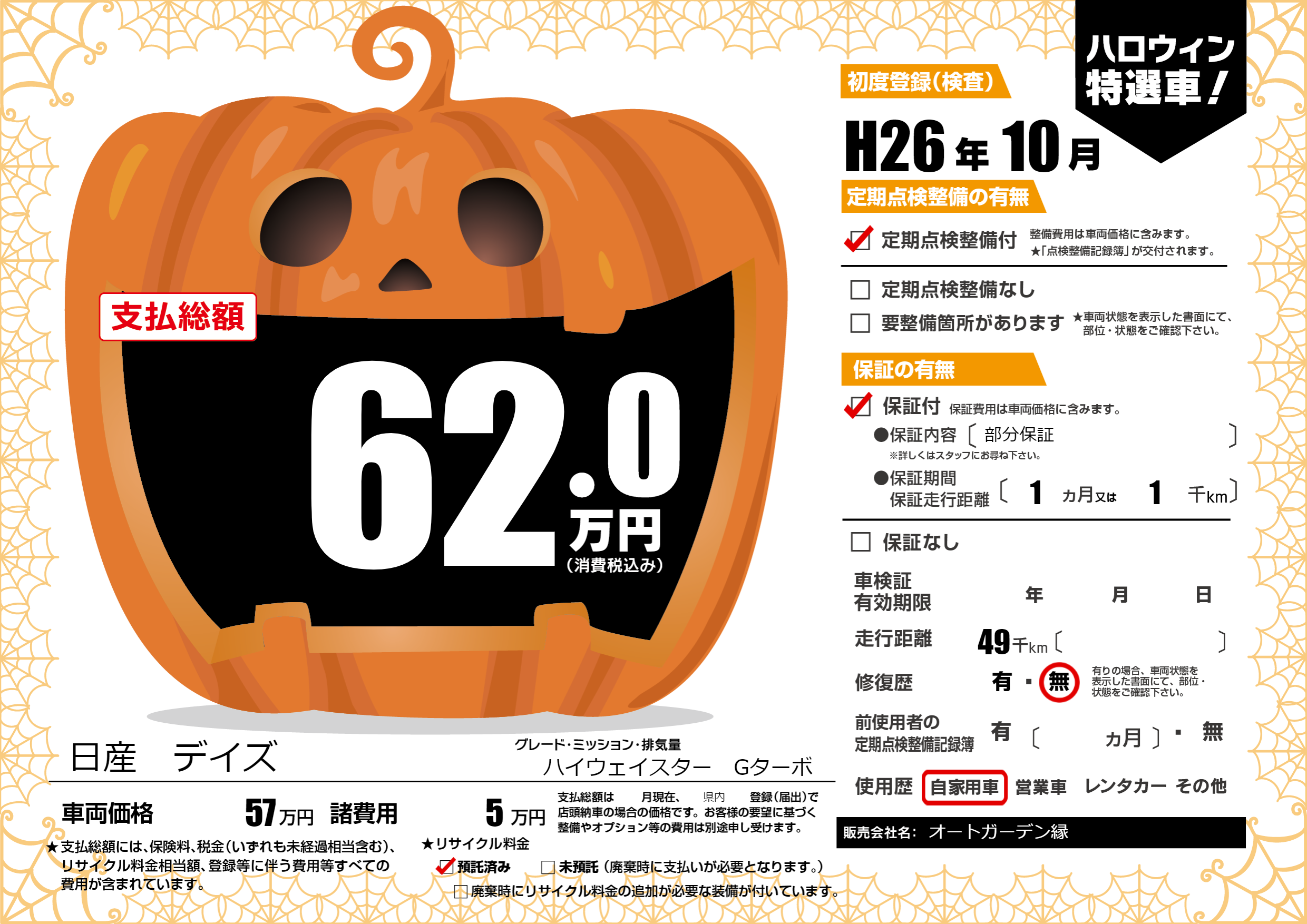 | 走行キロ | 4.9万km | 初年度登録 | H26年10月 |