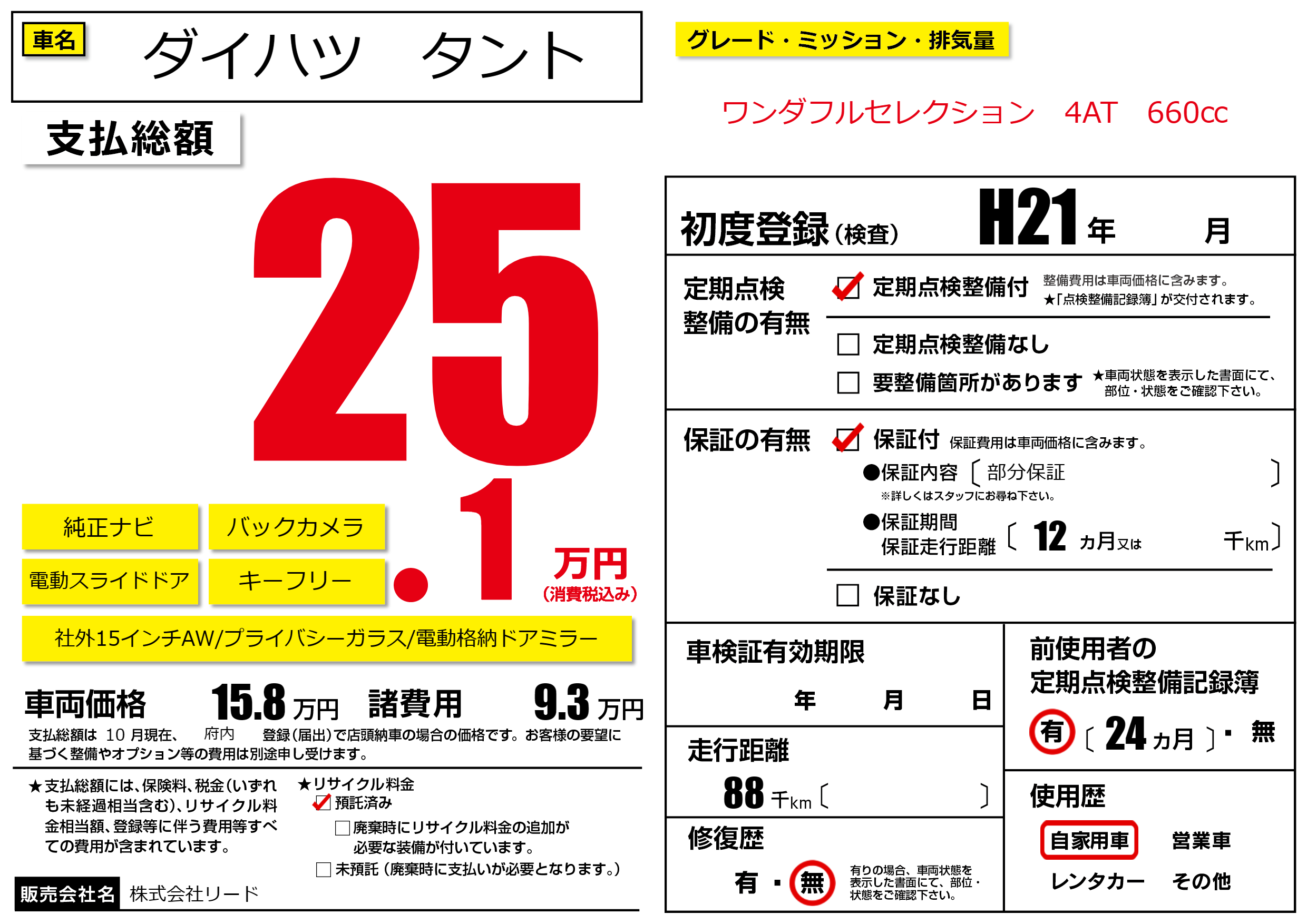| 車名 | ダイハツ タント | グレード ミッション 排気量 |