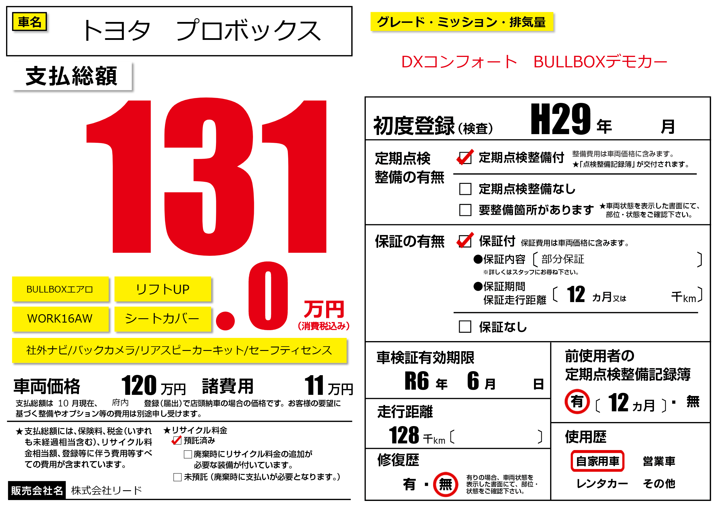 | 車検制限 | R6年 6月 - 日 | ||