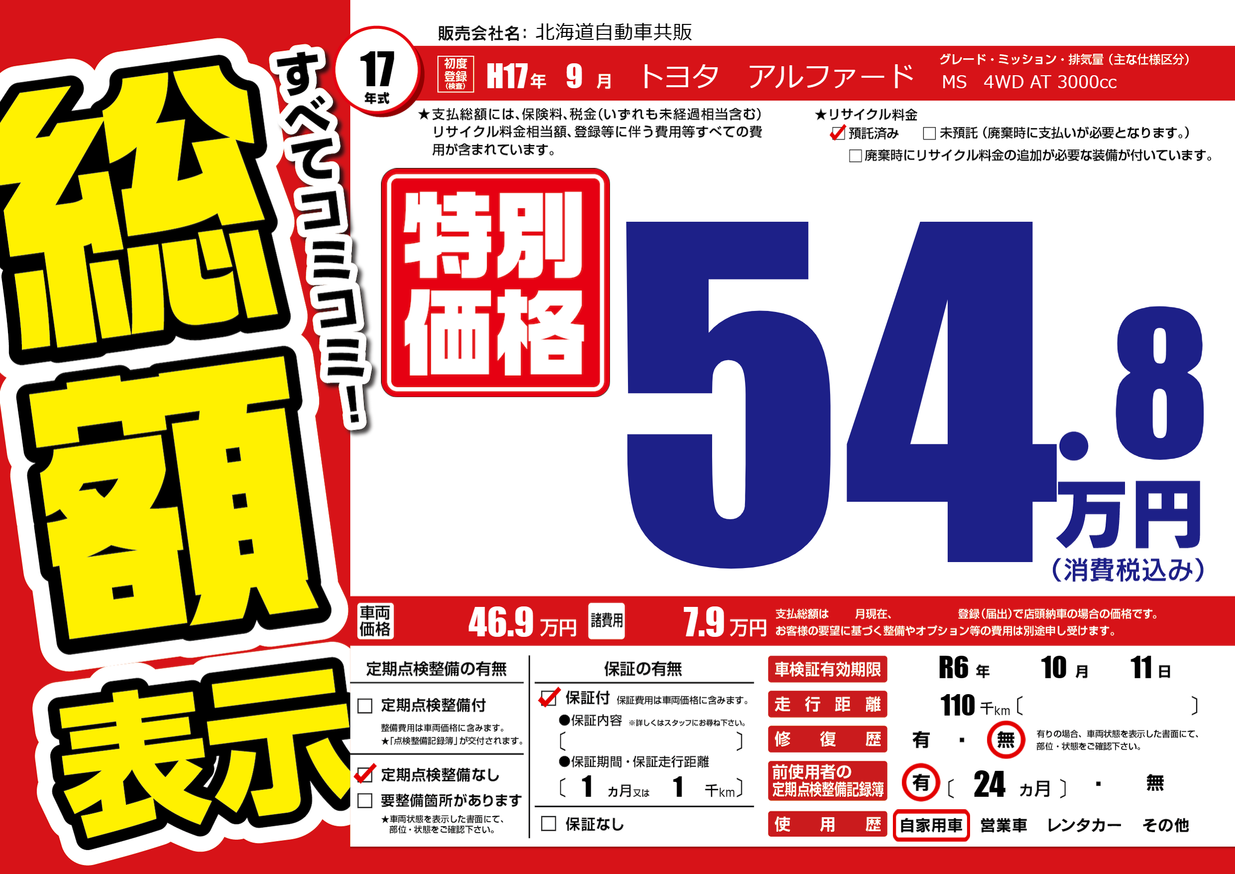 | 走行キロ | 11万km | 初年度登録 | H17年9月 |