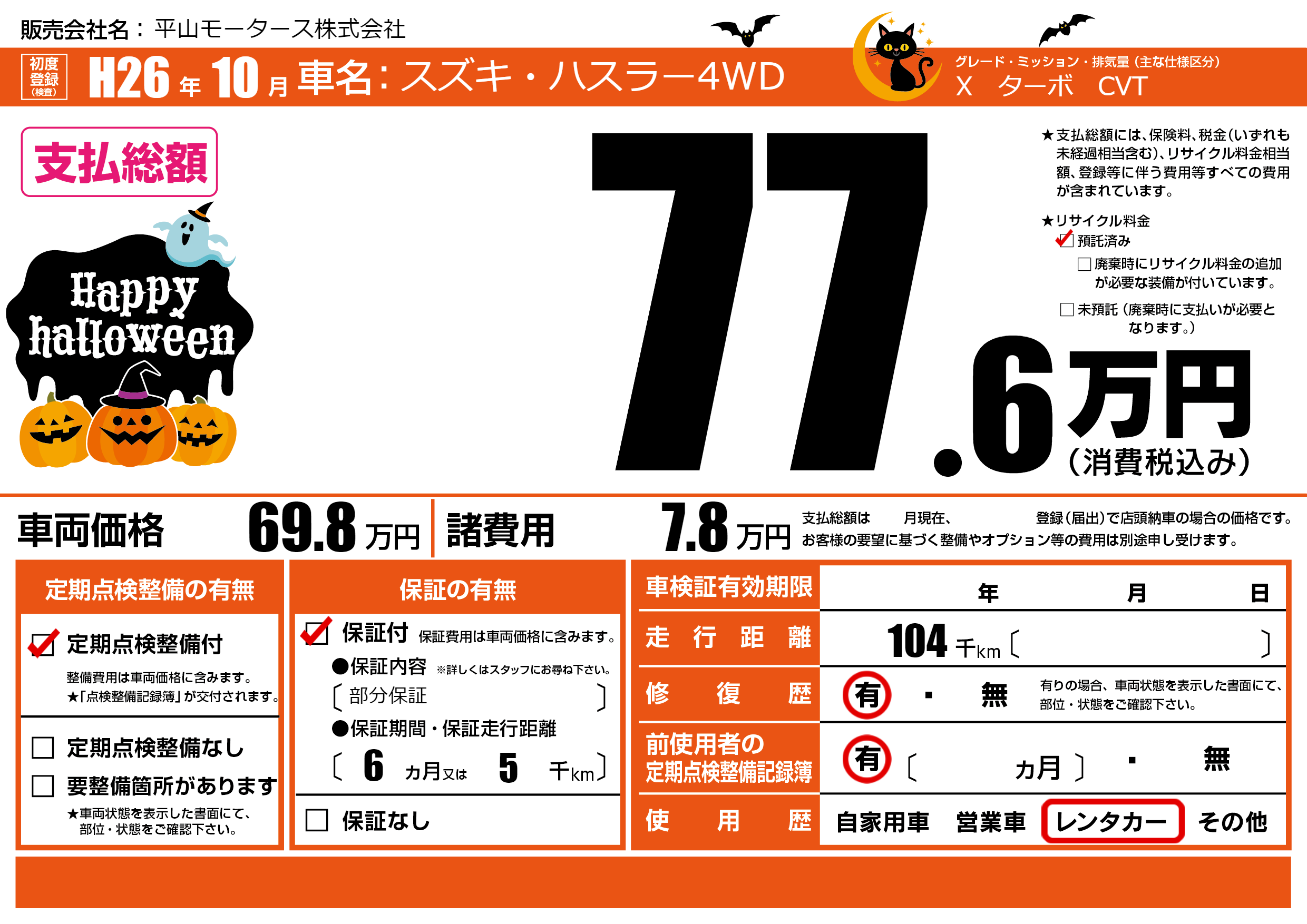 | 走行キロ | 10.4万km | 初年度登録 | H26年10月 |