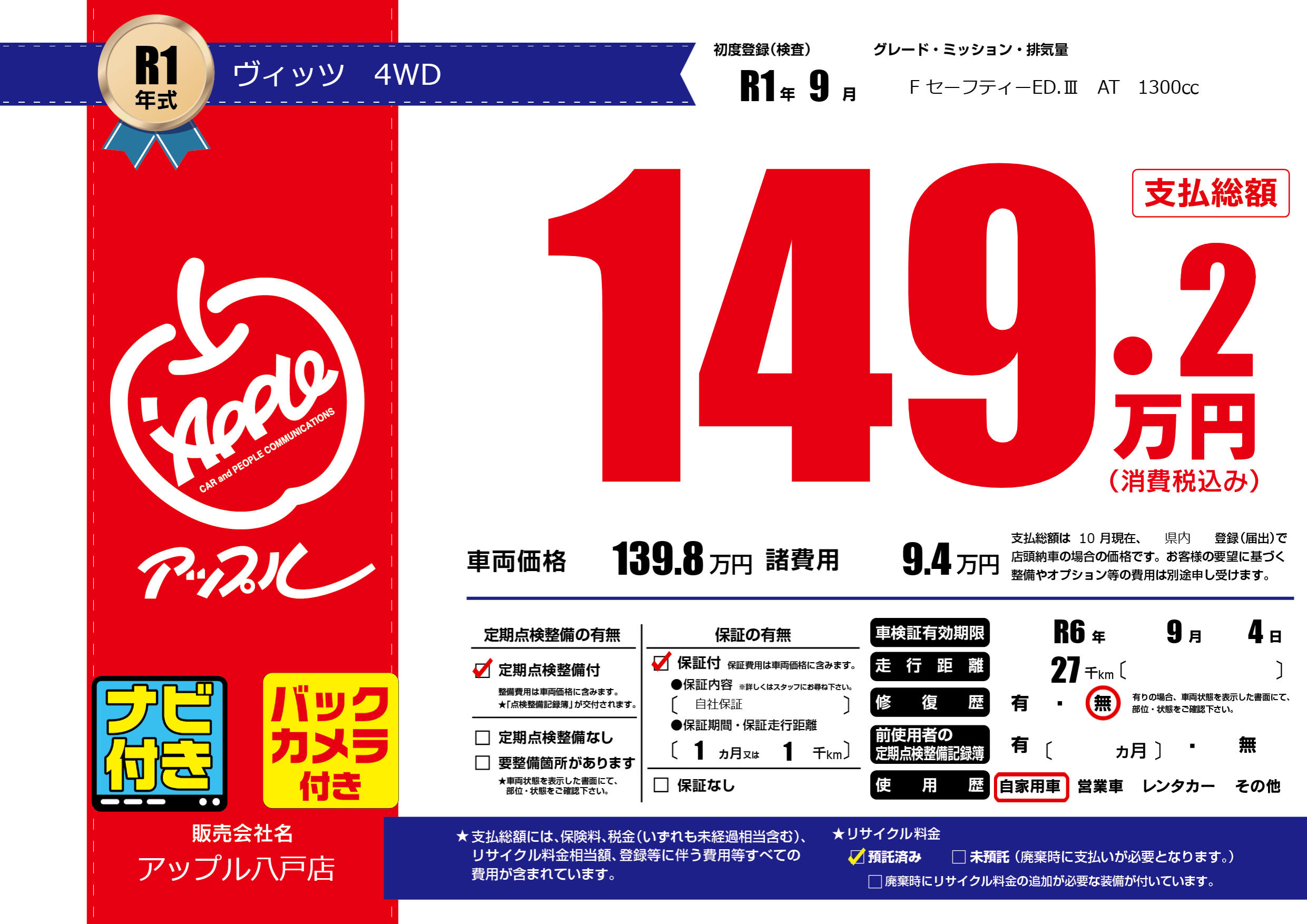 | 車名 | ヴィッツ 4WD | グレード ミッション 排気量 |