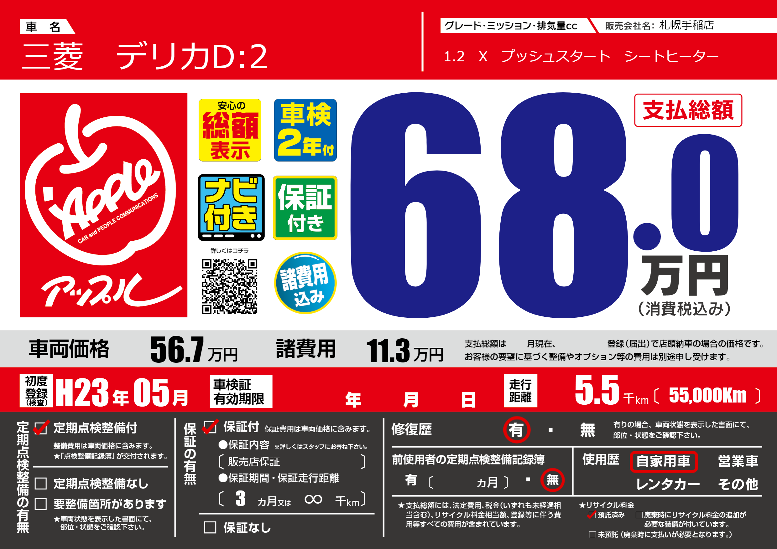 | 走行キロ | 0.5万km | 初年度登録 | H23年05月 |