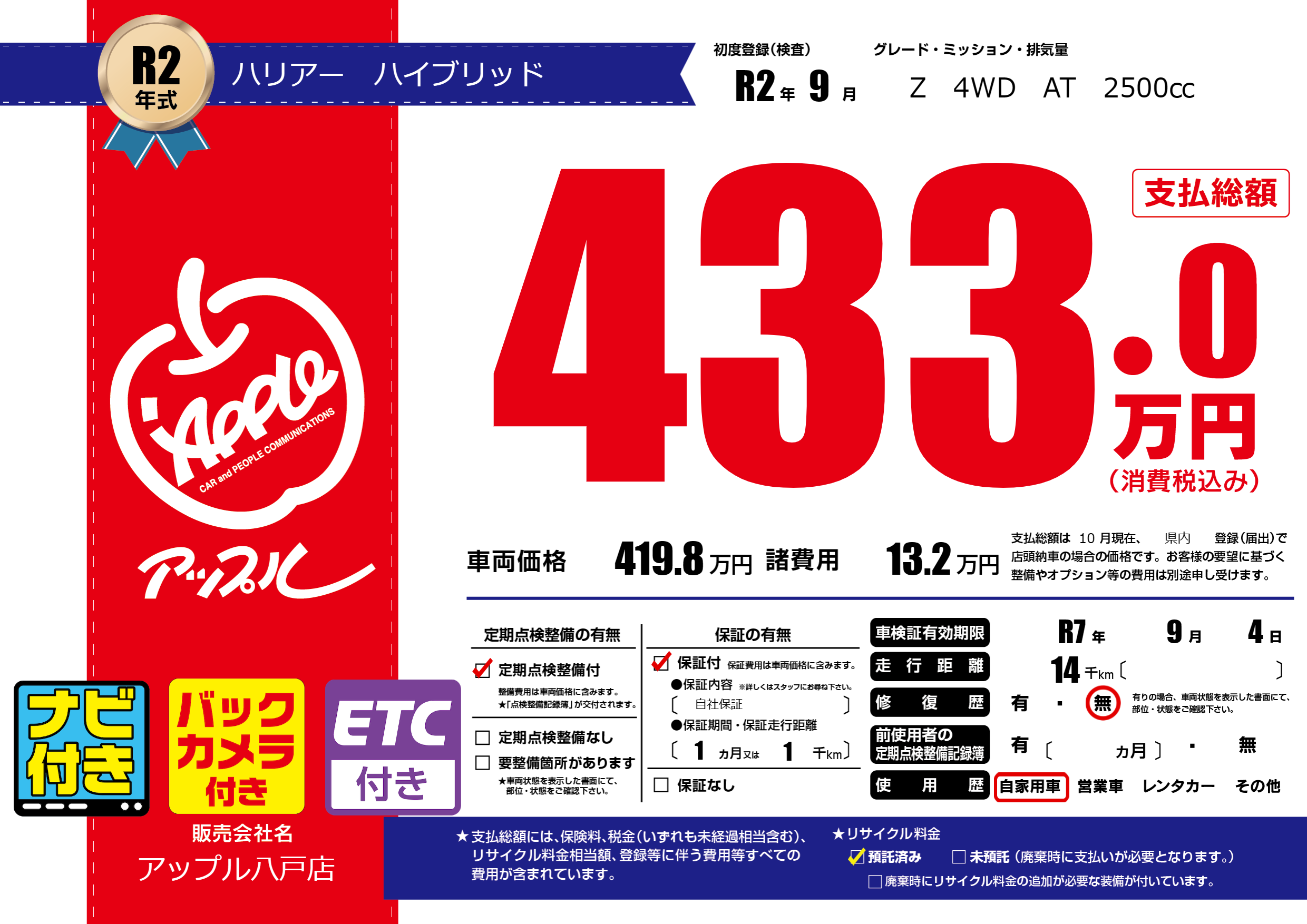 | 車名 | ハリアー ハイブリッド | グレード ミッション 排気量 |