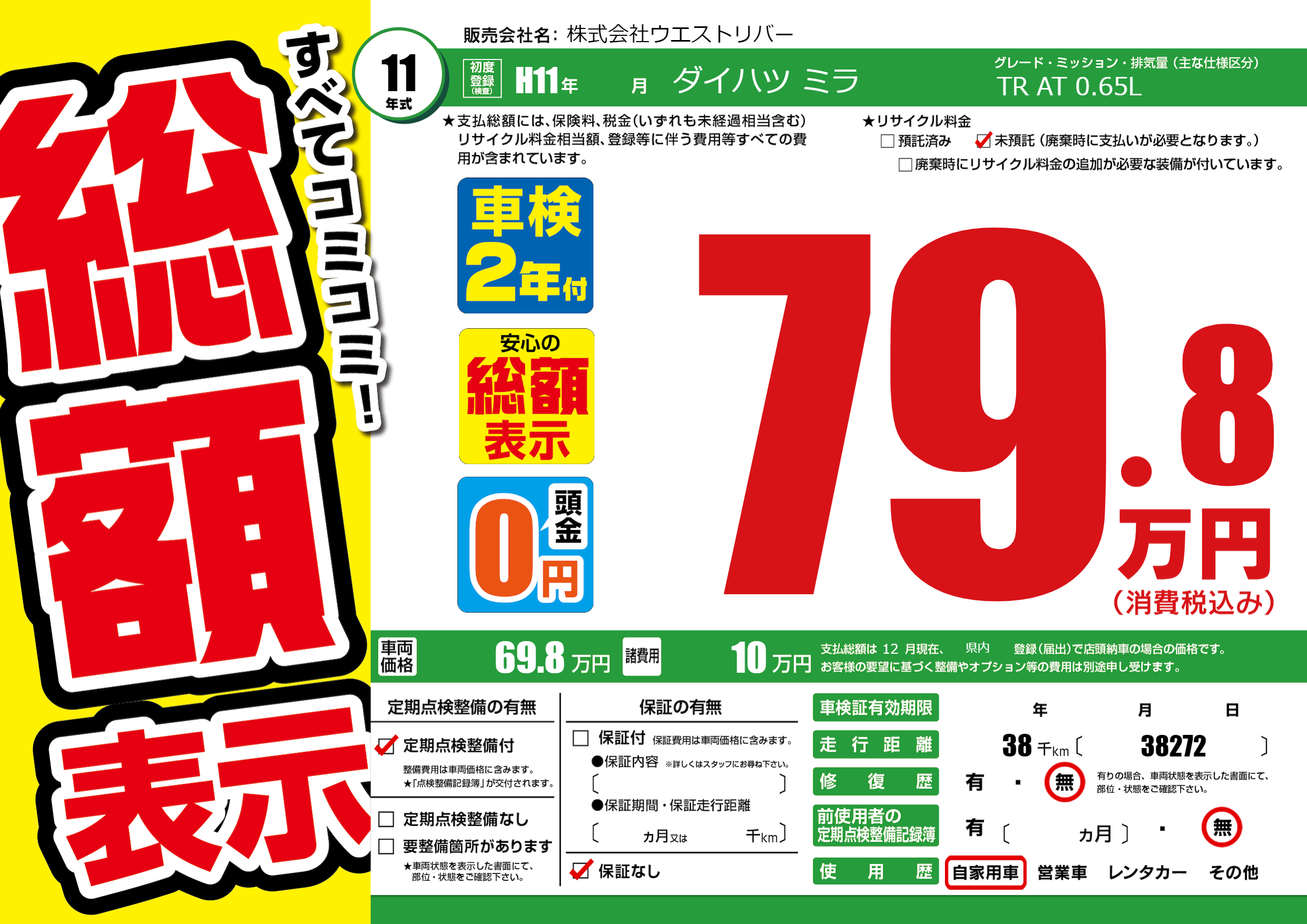 | 車名 | ダイハツ ミラ | グレード ミッション 排気量 |