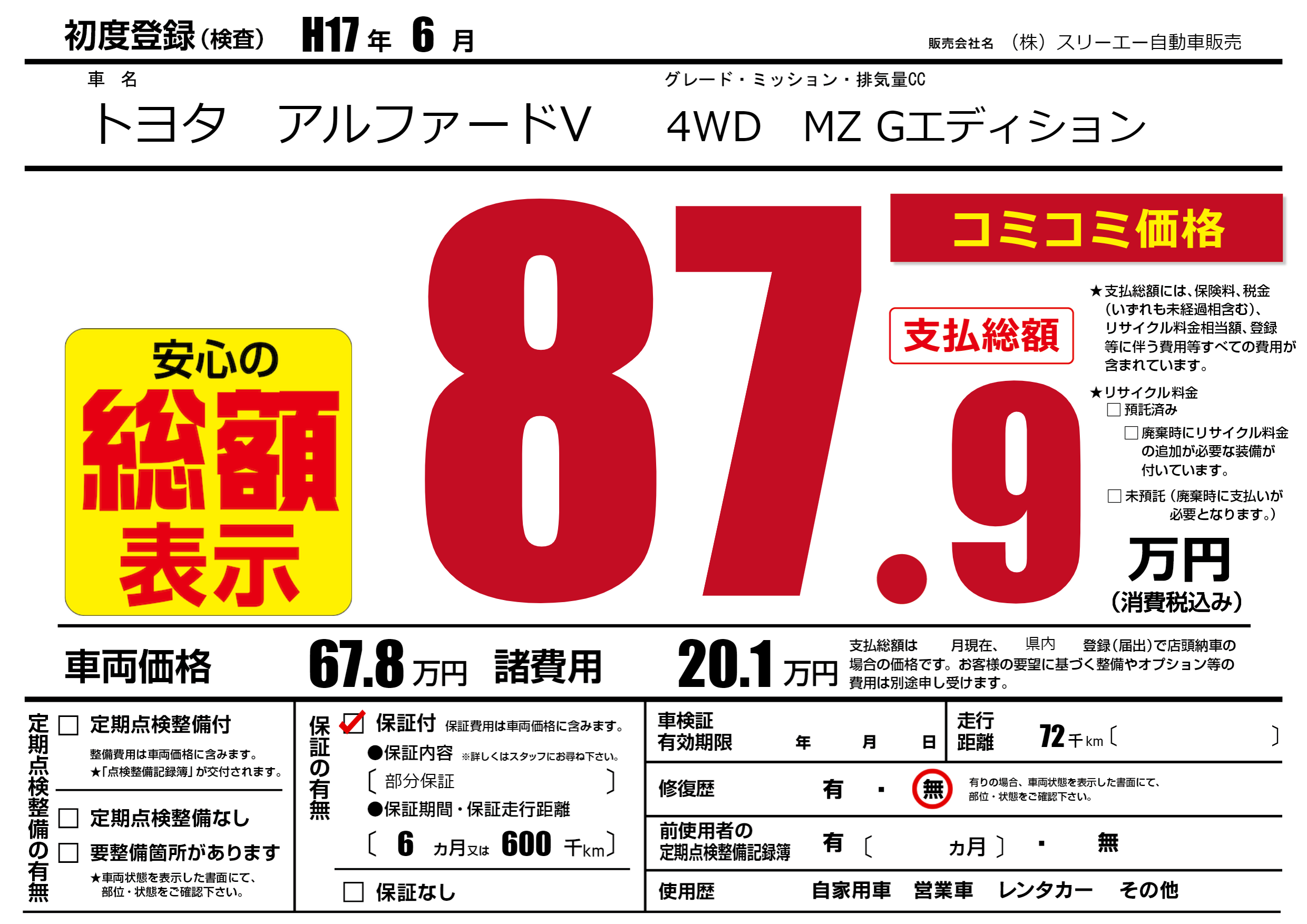 | 走行キロ | 7.2万km | 初年度登録 | H17年6月 |