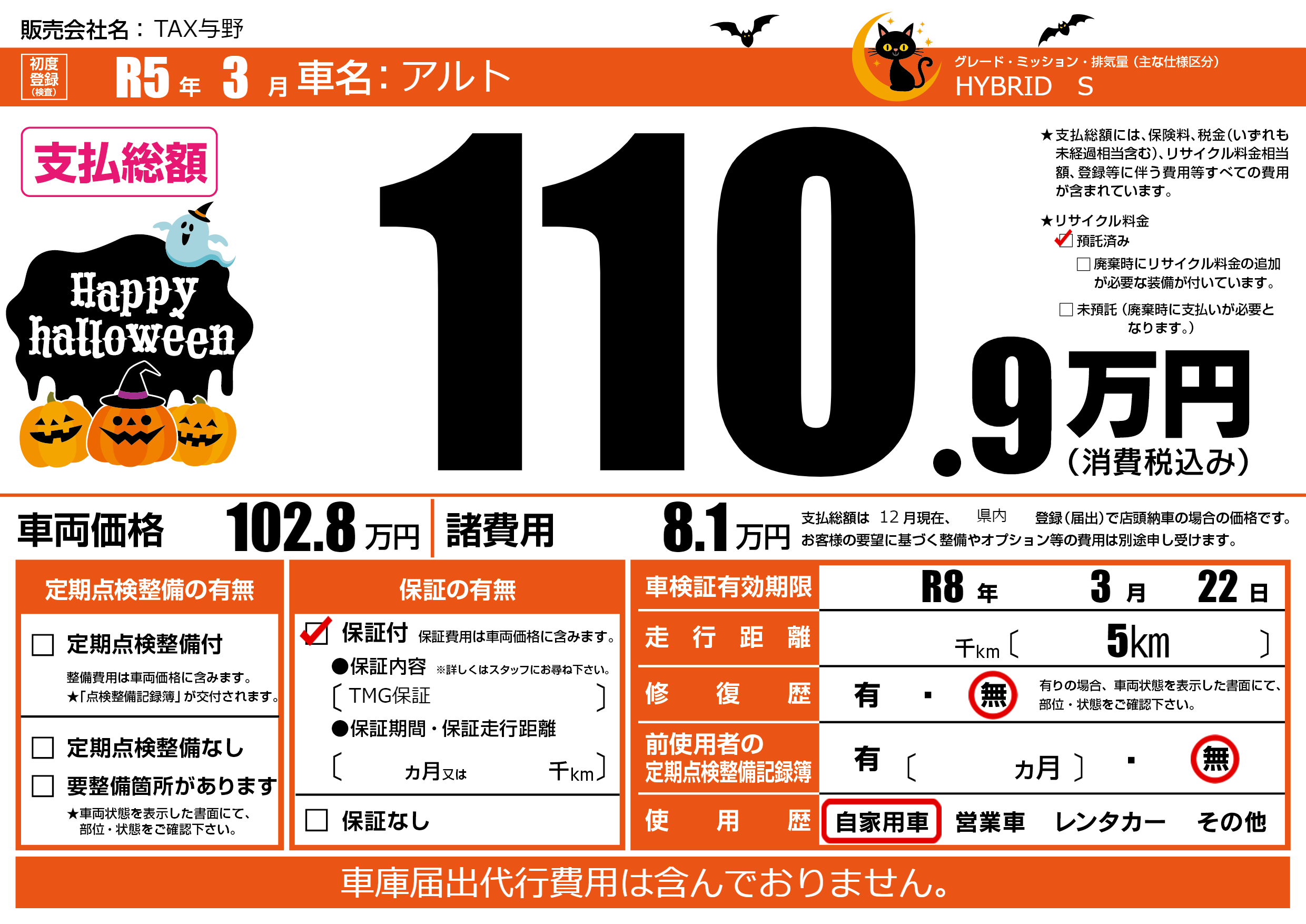 保証付き 保証内容(TMG保証) ---ヶ月または()千kmまで |