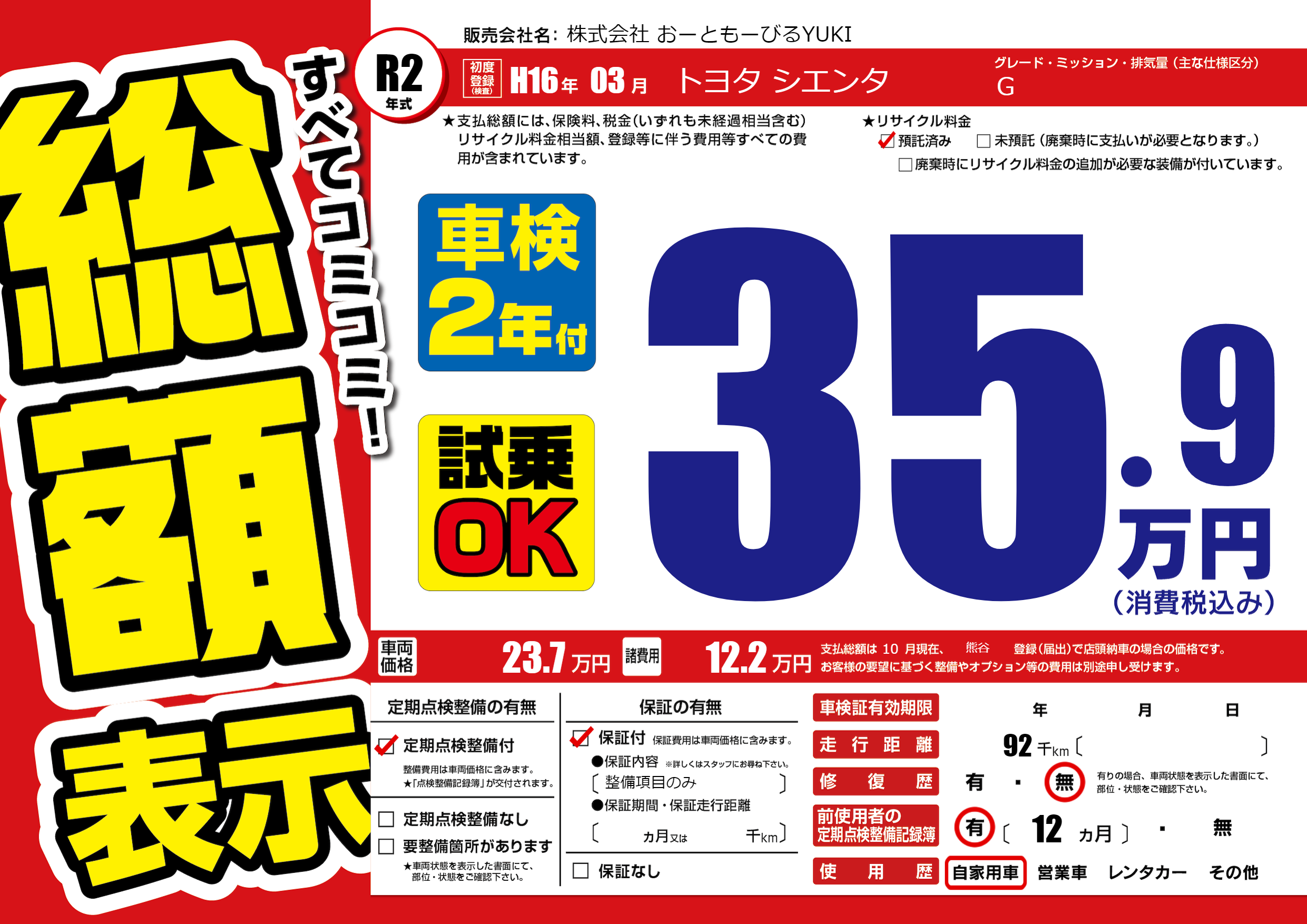 | 車名 | トヨタ シエンタ | グレード ミッション 排気量 |