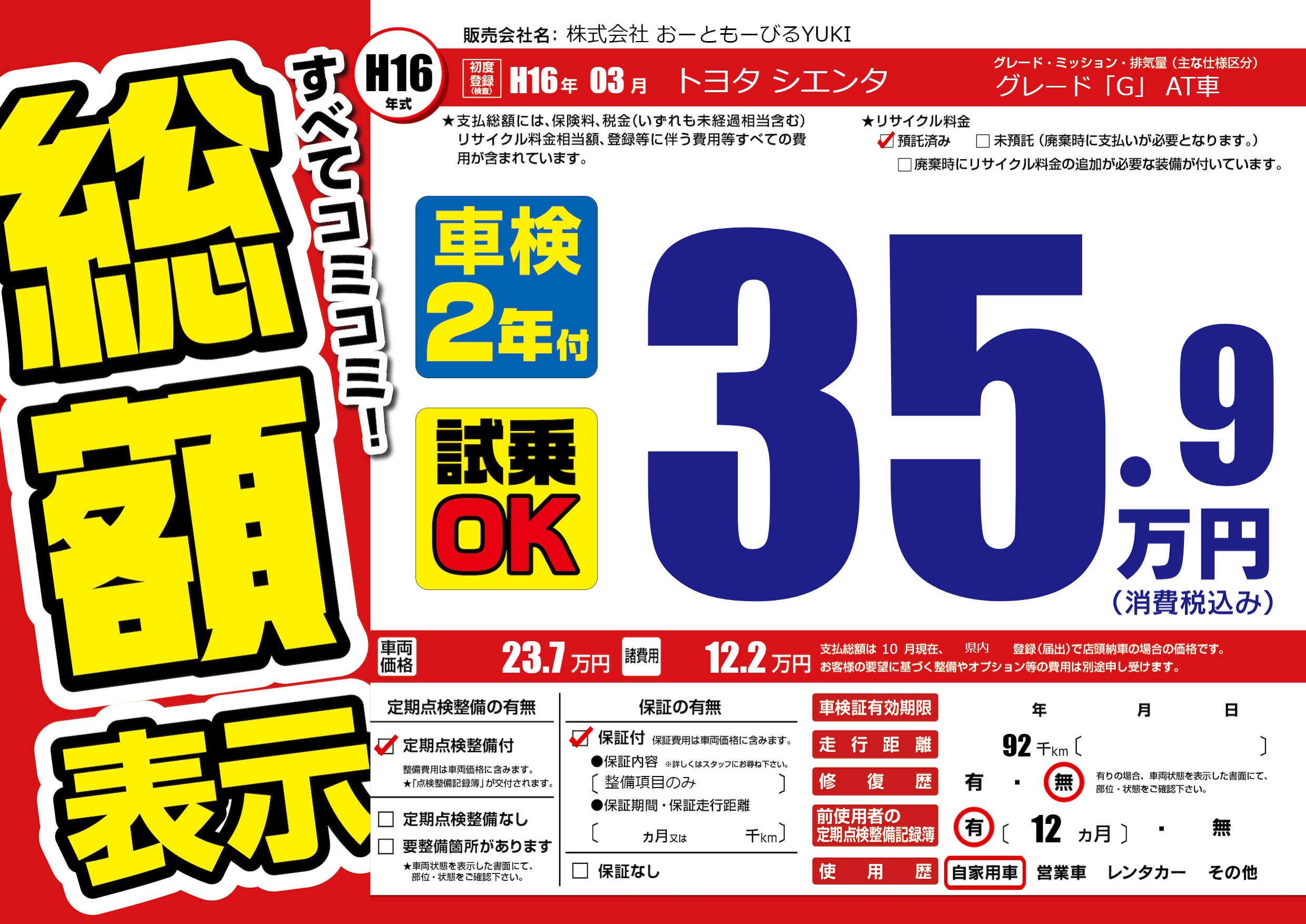 | 車名 | トヨタ シエンタ | グレード ミッション 排気量 |