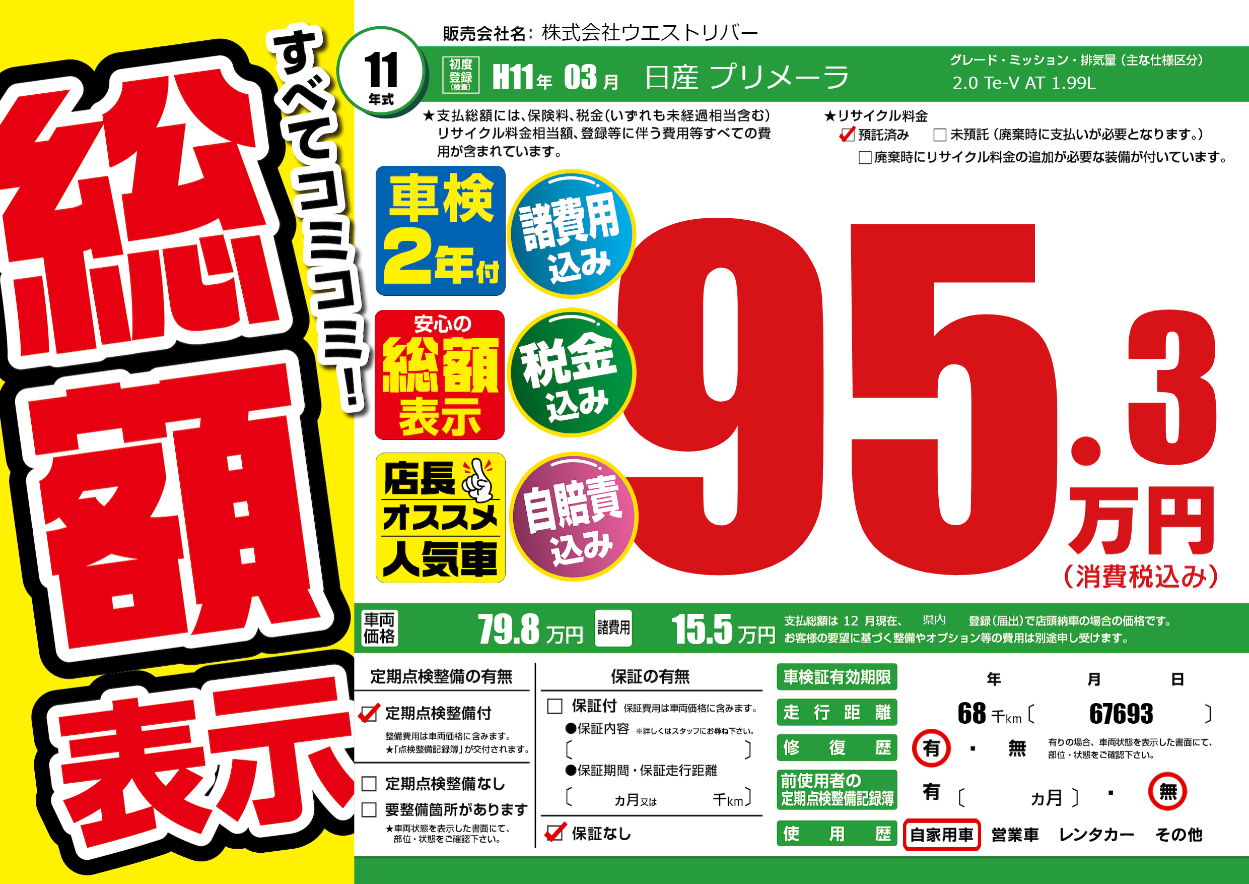 | 車名 | 日産 プリメーラ | グレード ミッション 排気量 |