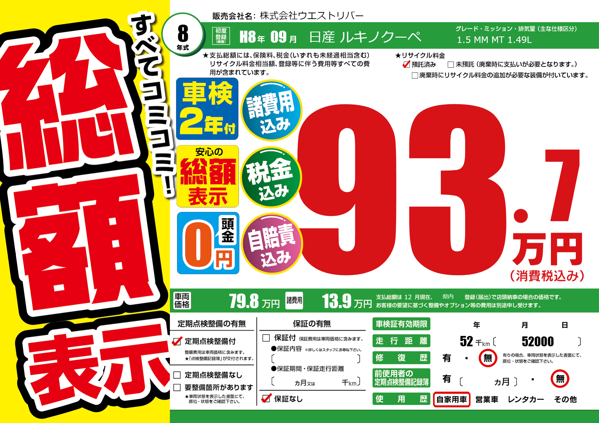 | 走行キロ | 5.2万km | 初年度登録 | H8年09月 |