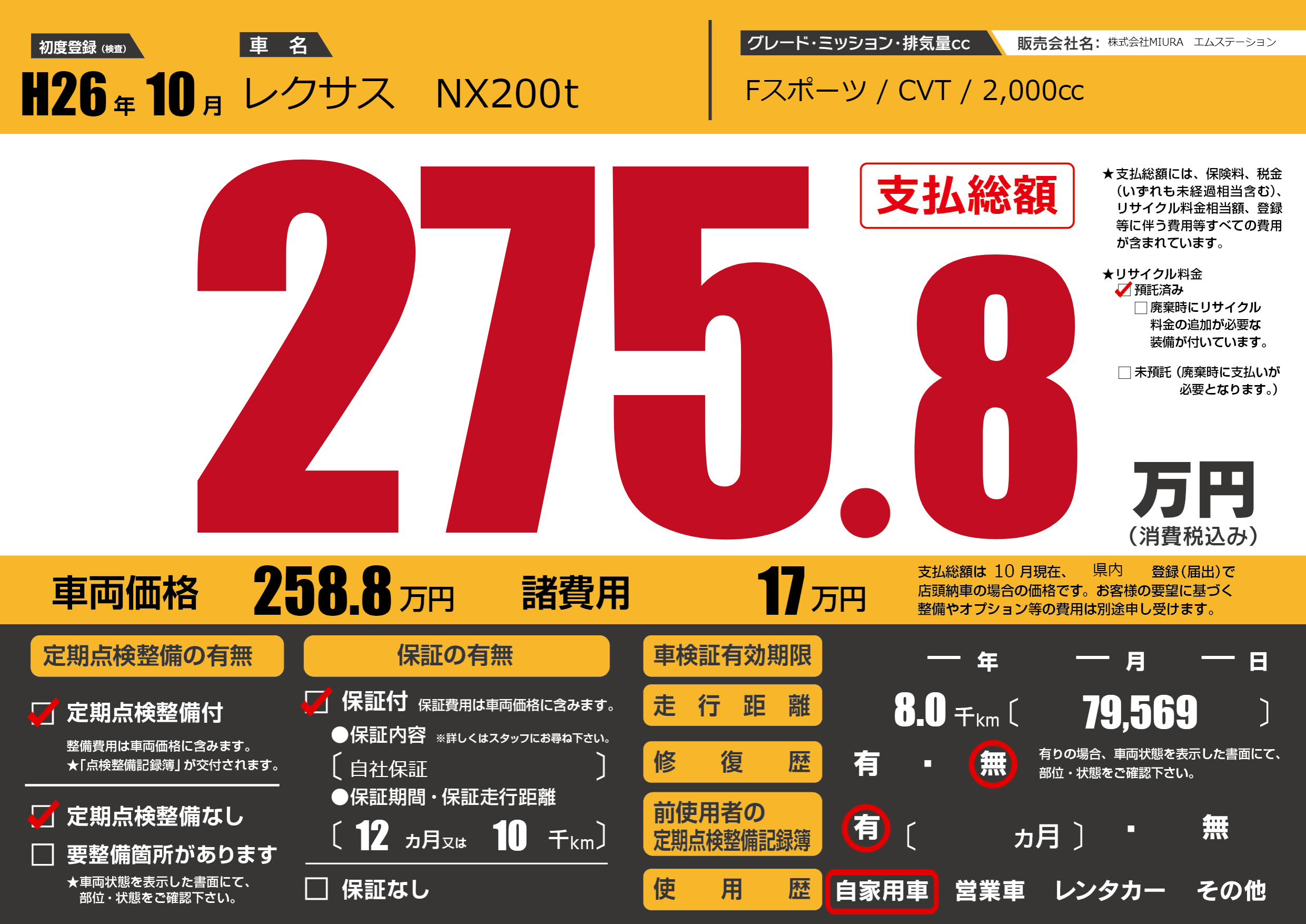 | 走行キロ | 0.8万km | 初年度登録 | H26年10月 |