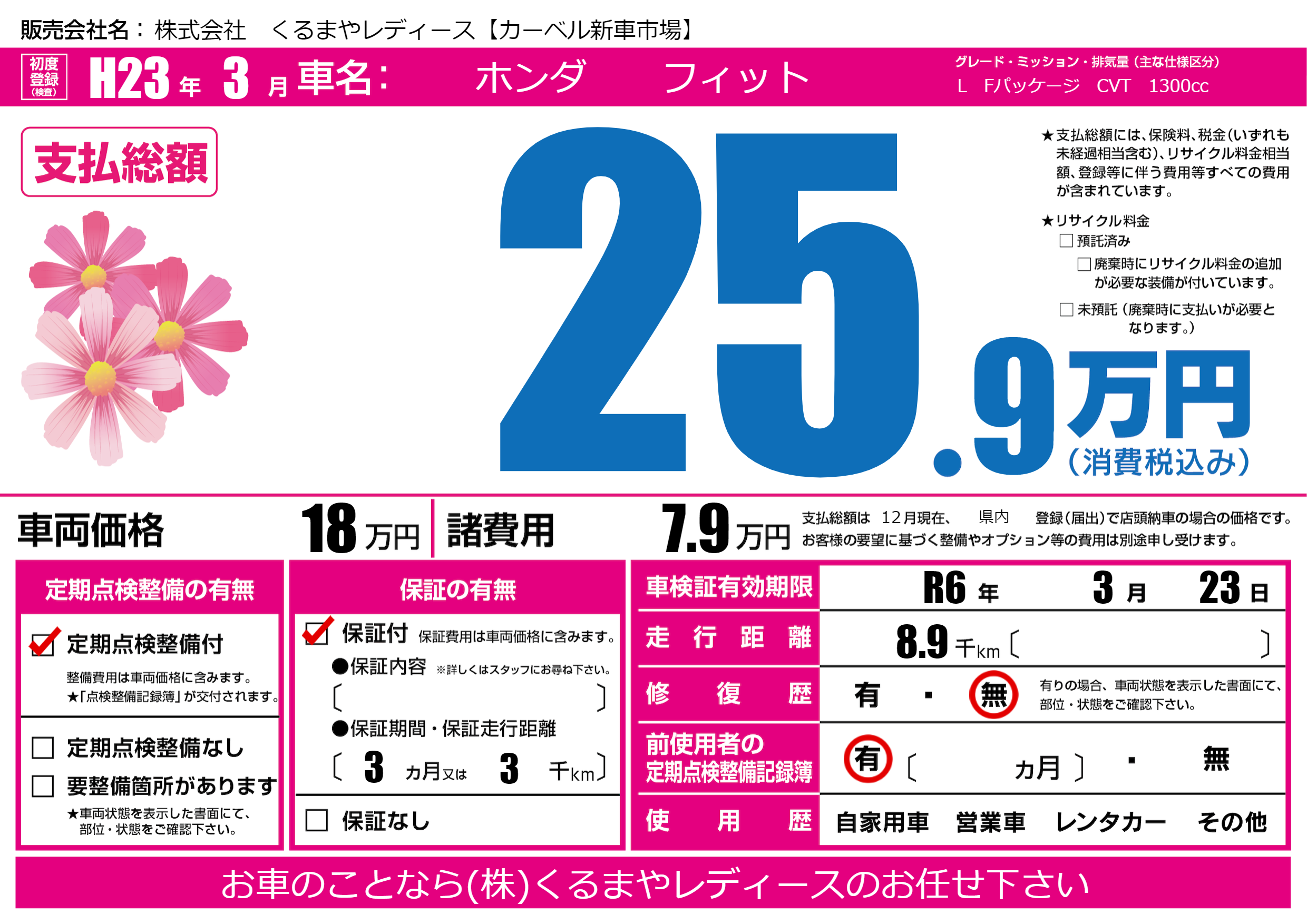 | 走行キロ | 0.8万km | 初年度登録 | H23年3月 |