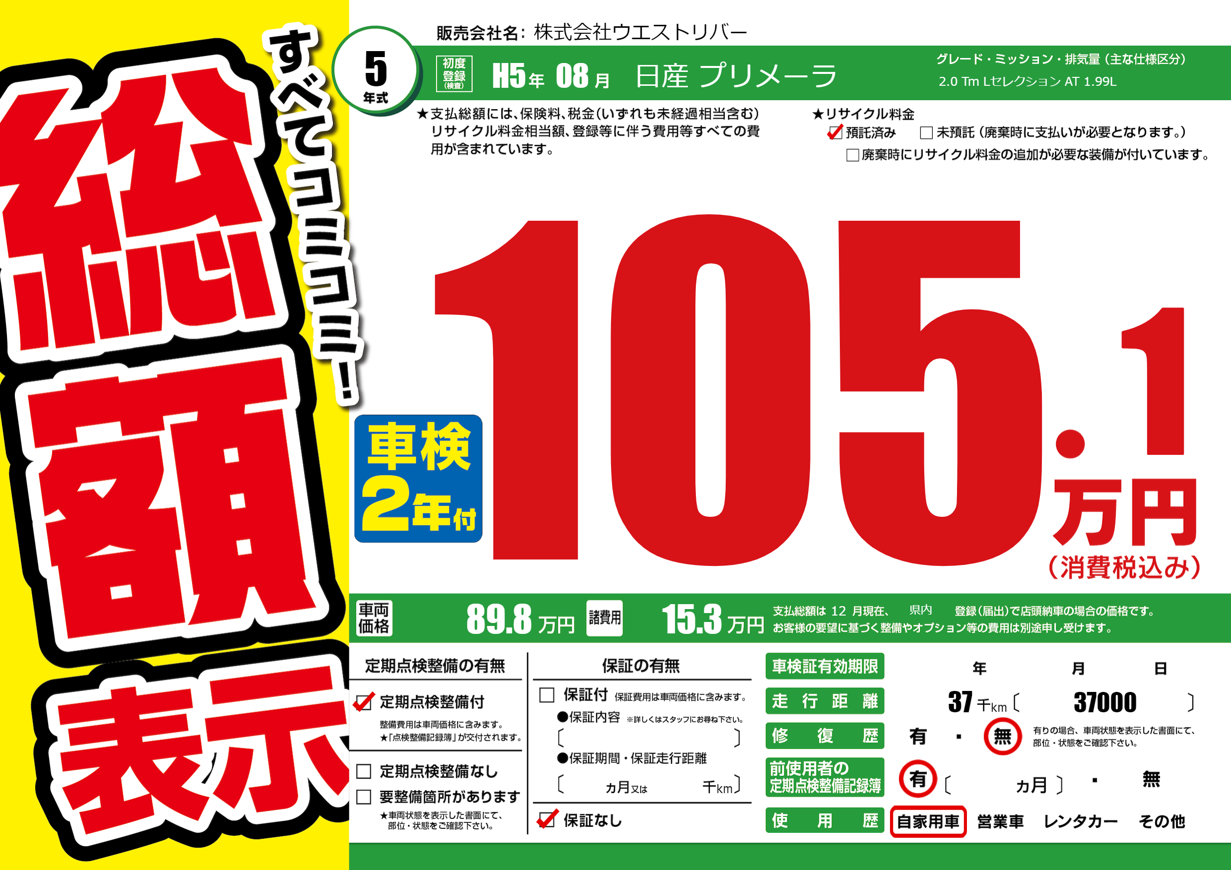 | 走行キロ | 3.7万km | 初年度登録 | H5年08月 |