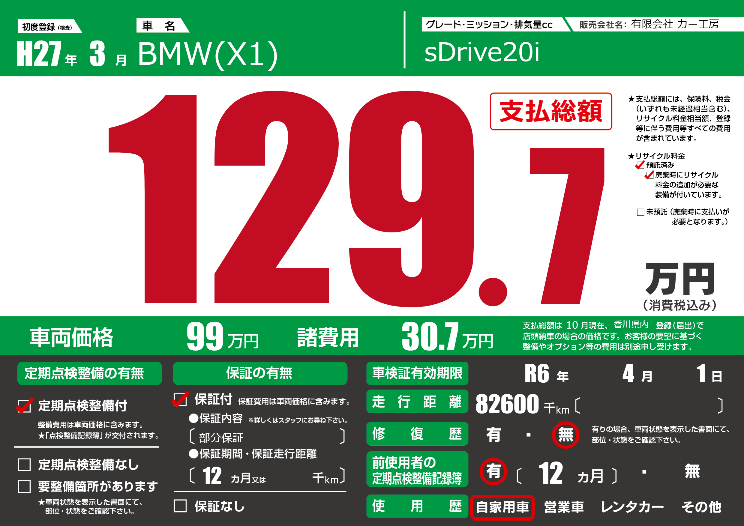 | 車名 | BMW(X1) | グレード ミッション 排気量 |