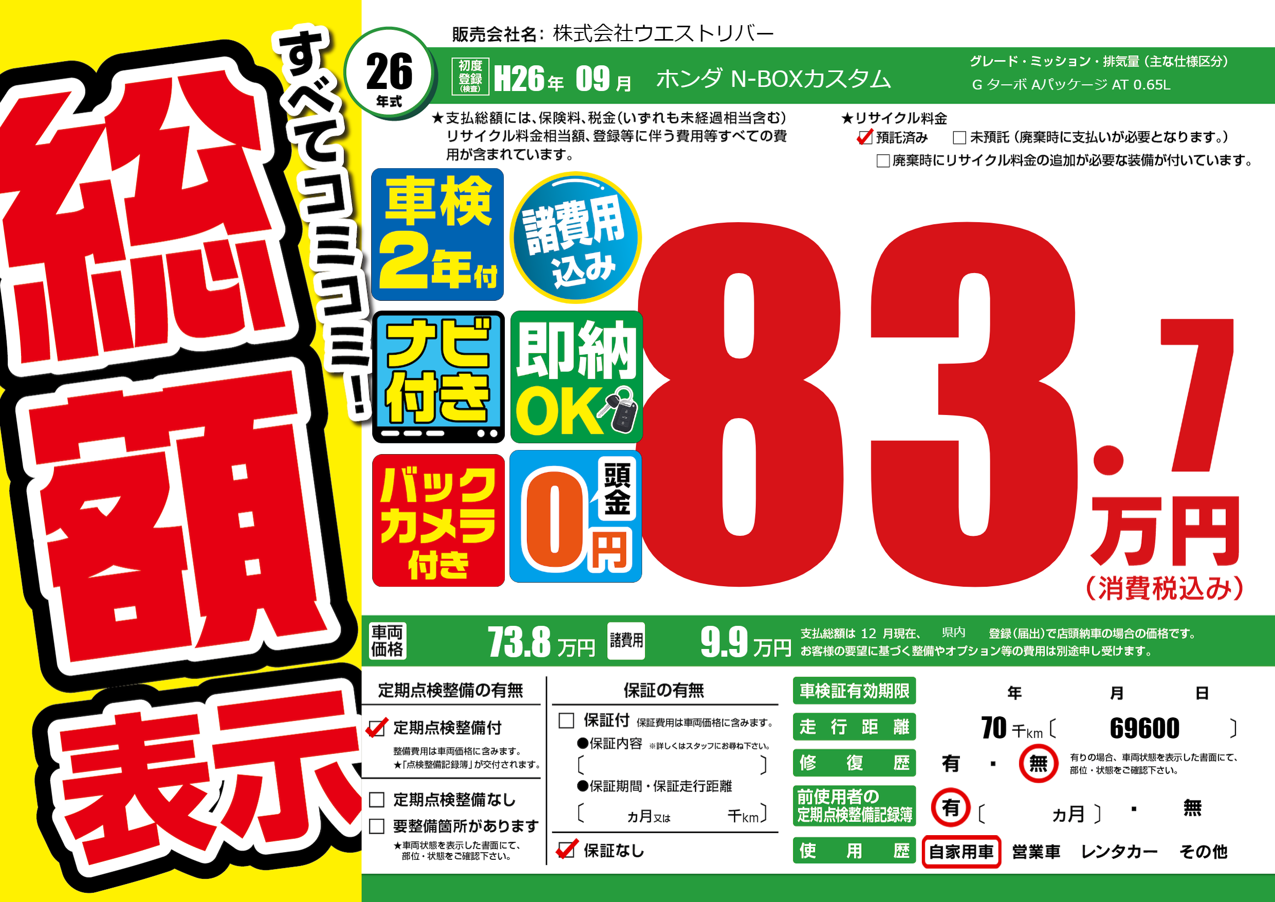 | 走行キロ | 7万km | 初年度登録 | H26年09月 |