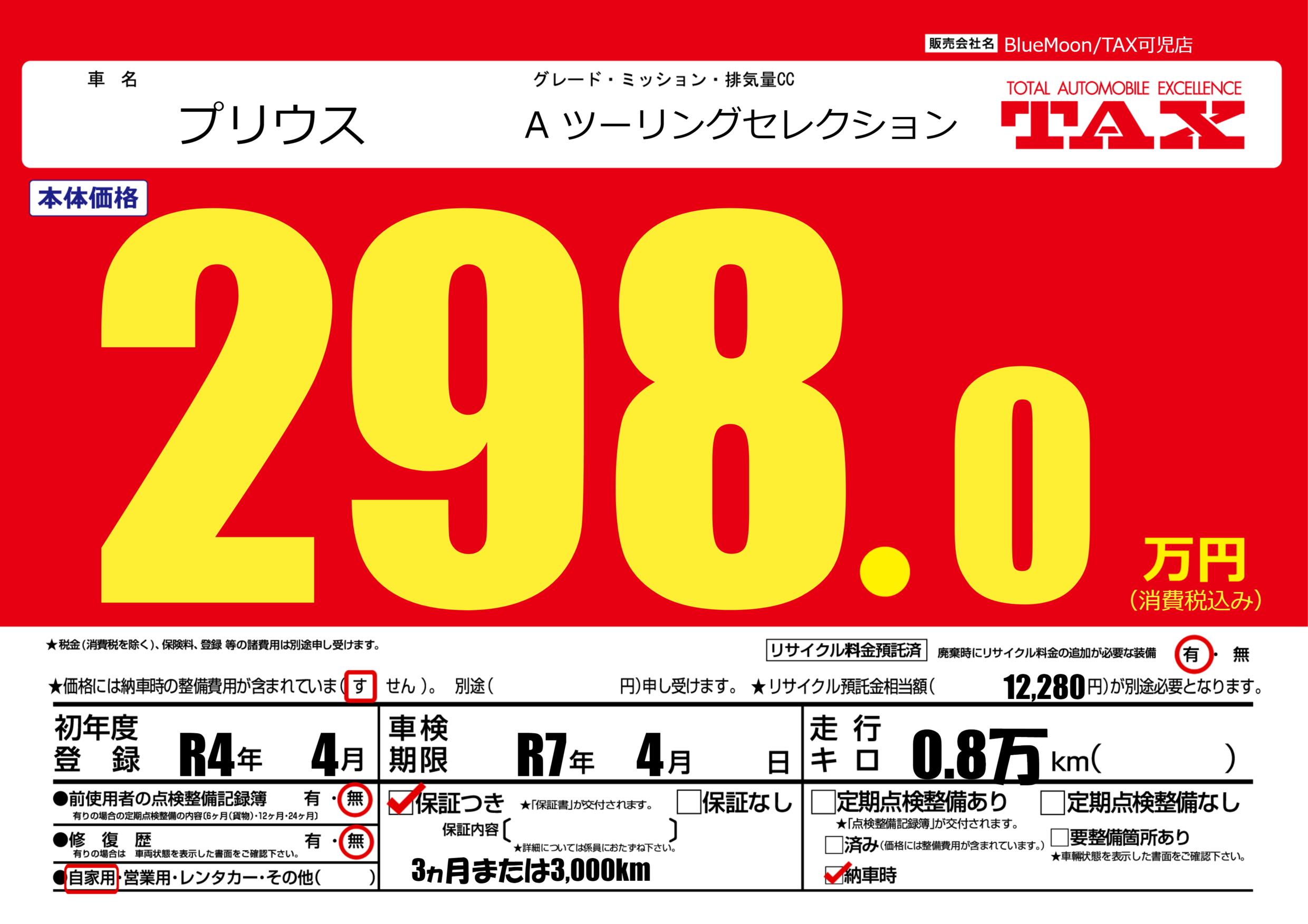 | 車名 | プリウス | グレード ミッション 排気量 |