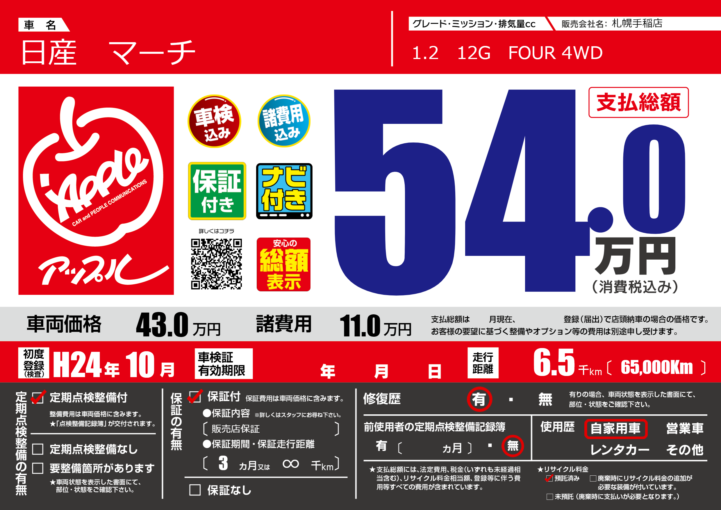 | 車名 | 日産 マーチ | グレード ミッション 排気量 |