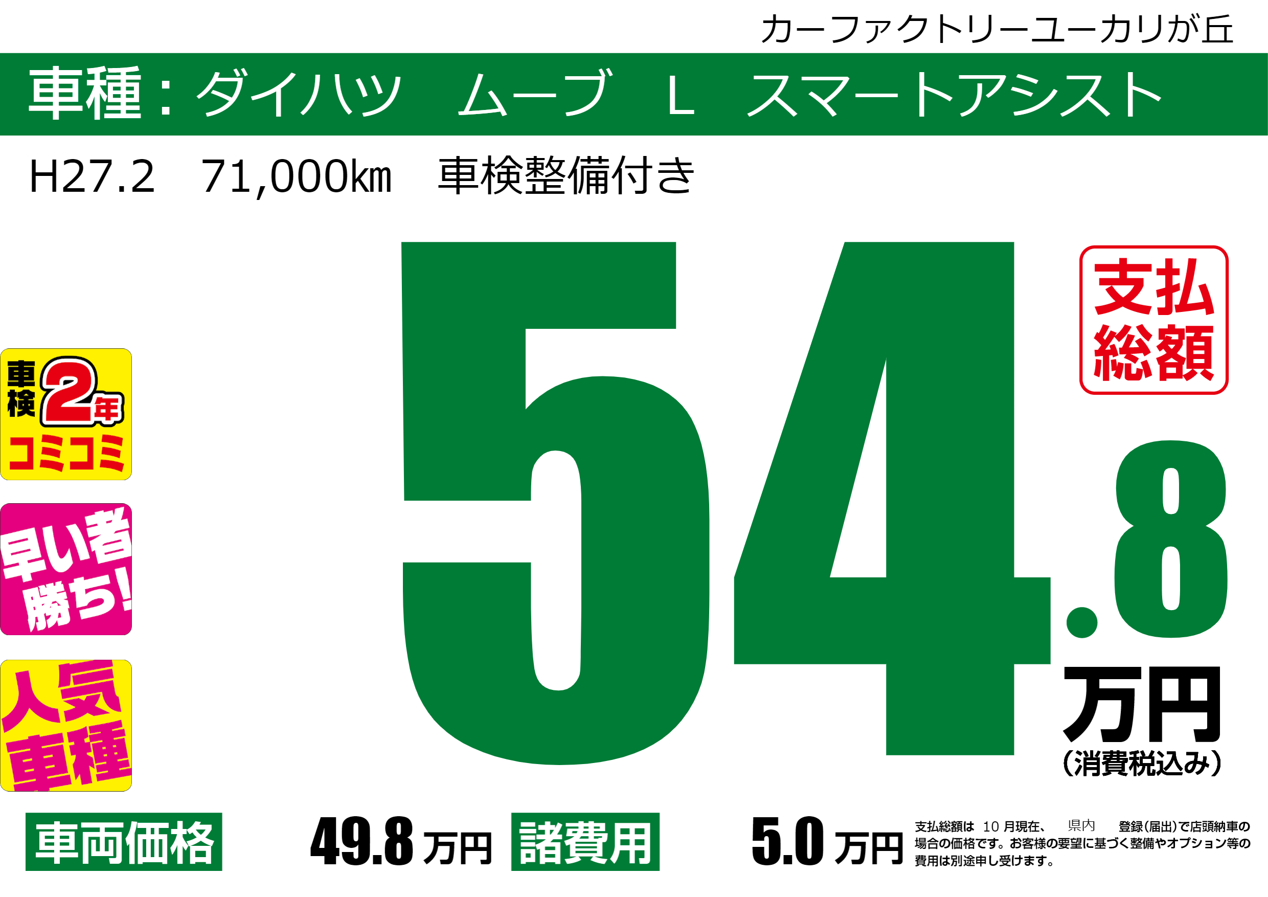 | 車名 | ダイハツ ムーブ L スマートアシスト | グレード ミッション 排気量 |