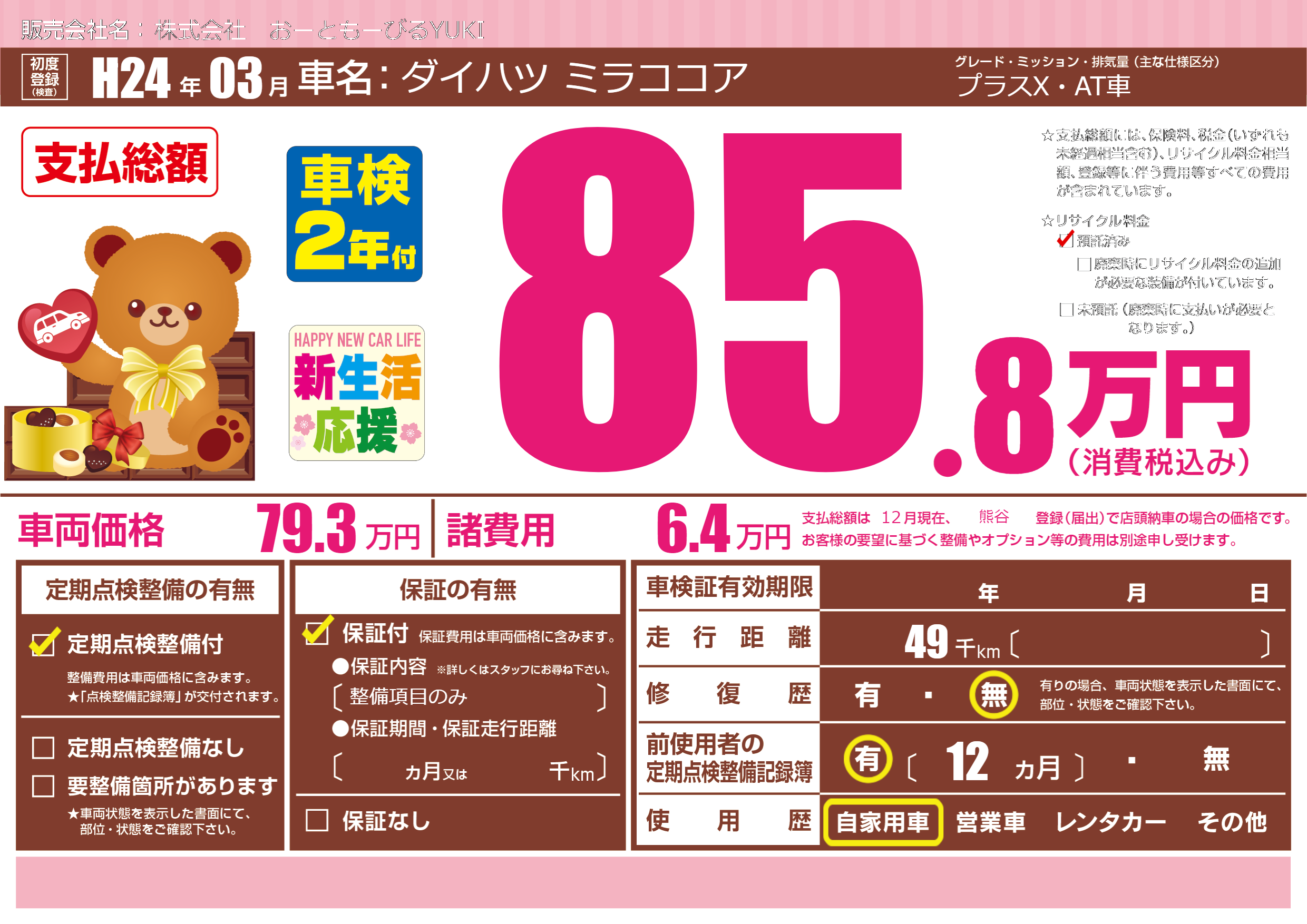 保証付き 保証内容(整備項目のみ) ---ヶ月または()千kmまで |