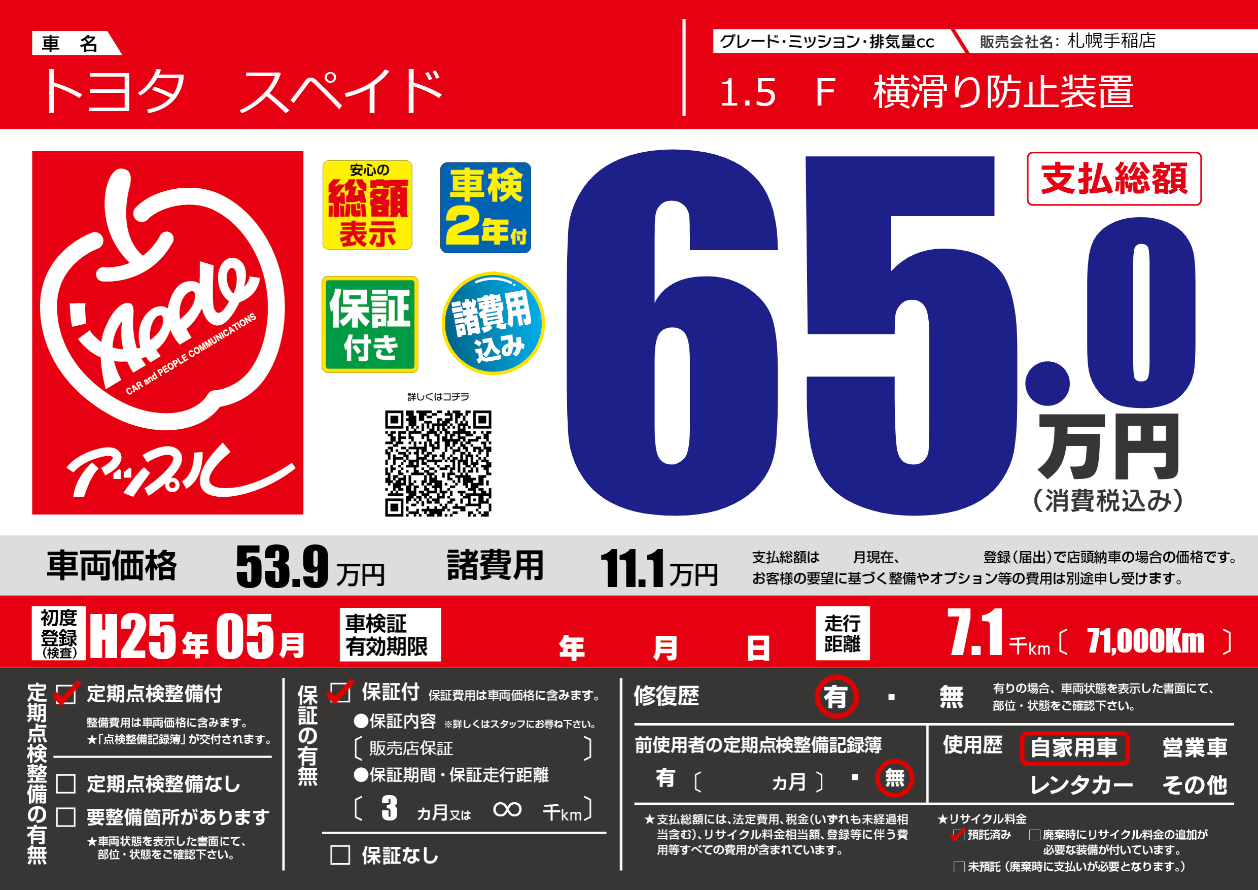 | 車名 | トヨタ スペイド | グレード ミッション 排気量 |