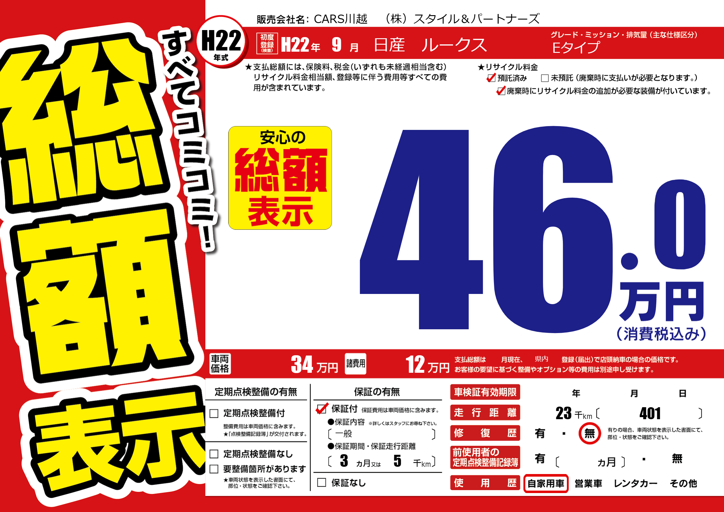 | 走行キロ | 2.3万km | 初年度登録 | H22年9月 |