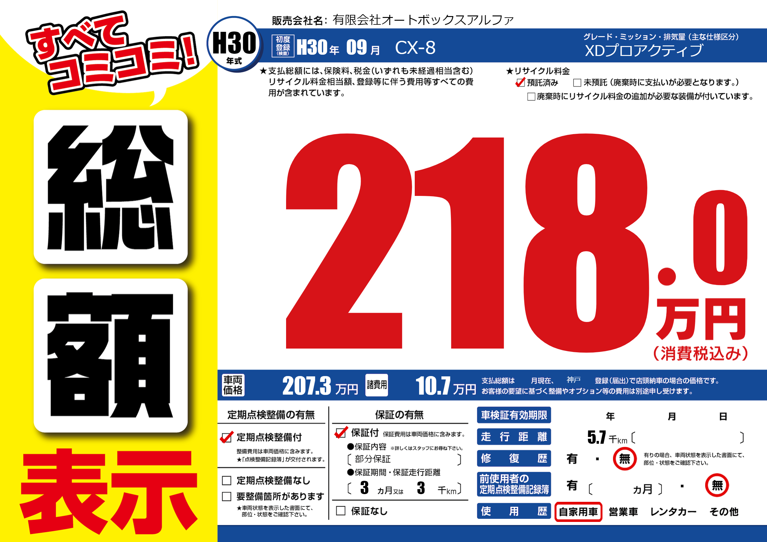 | 走行キロ | 0.5万km | 初年度登録 | H30年09月 |