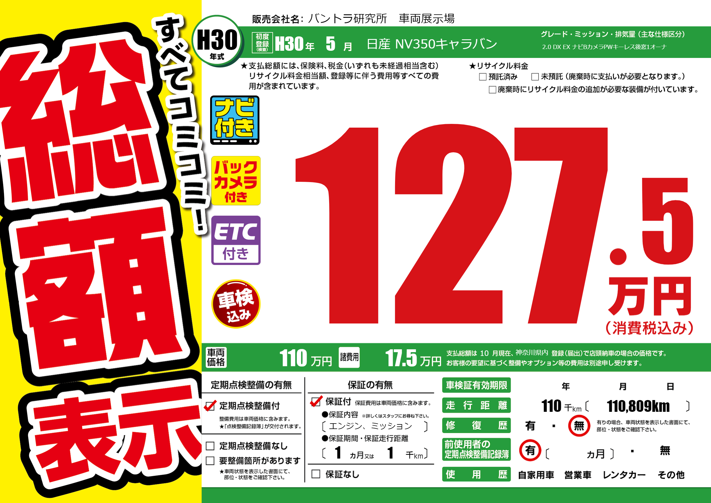 | 走行キロ | 11万km | 初年度登録 | H30年5月 |
